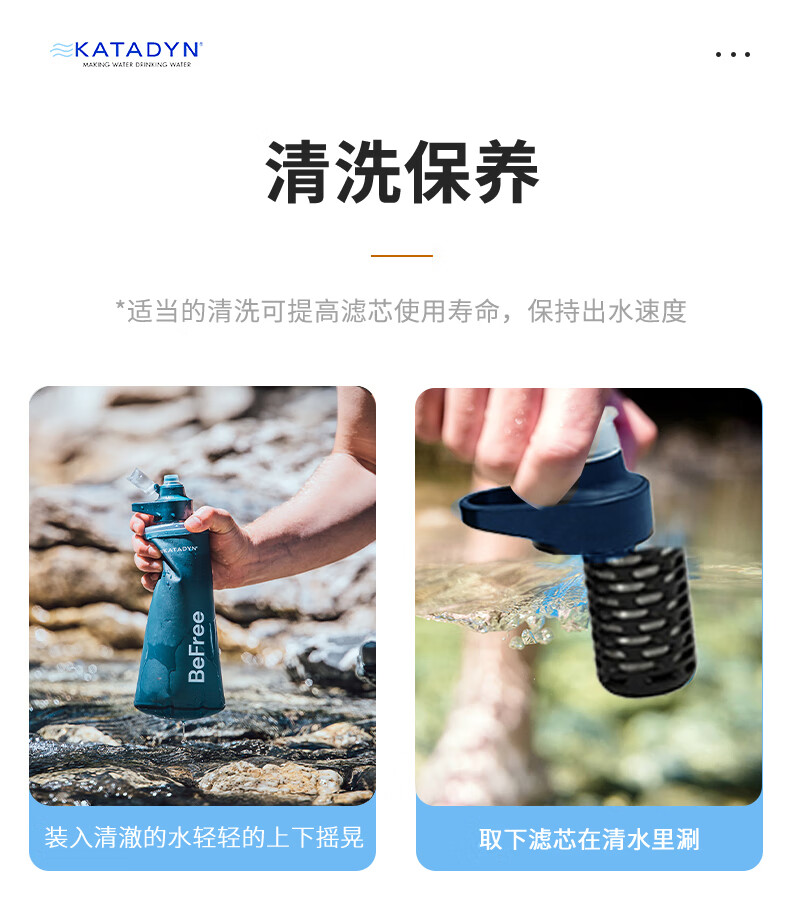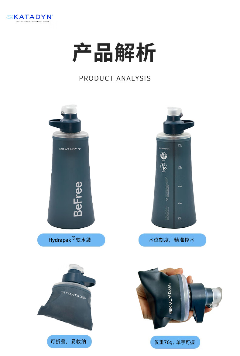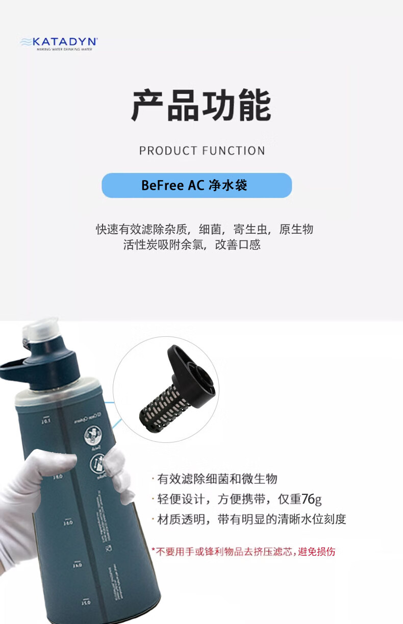 总的来说,KatADYN BeFree AC 1L蓝色(含滤芯)便携式户外净水袋凭借其卓越的过滤性能、便捷的携带方式和耐用的品质,成为了徒步登山等户外活动的理想选择。它不仅能确保您的饮水安全,还能让您更加专注于享受户外活动的乐趣。