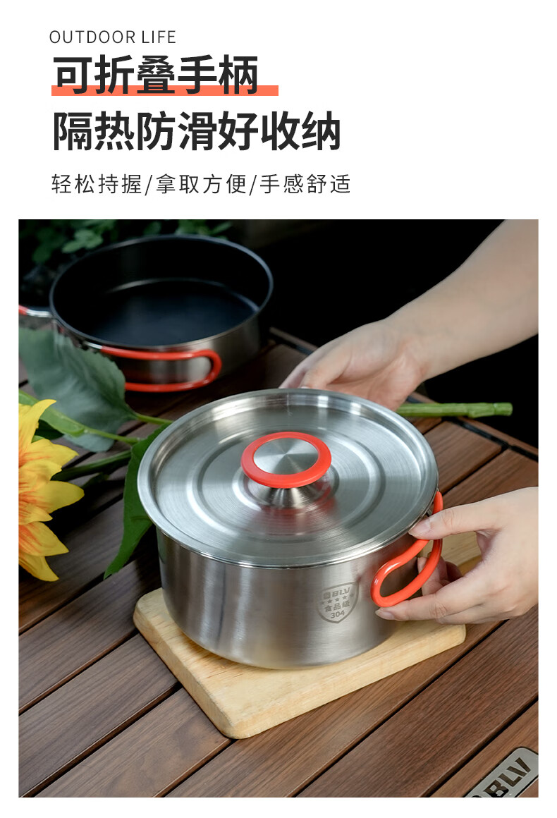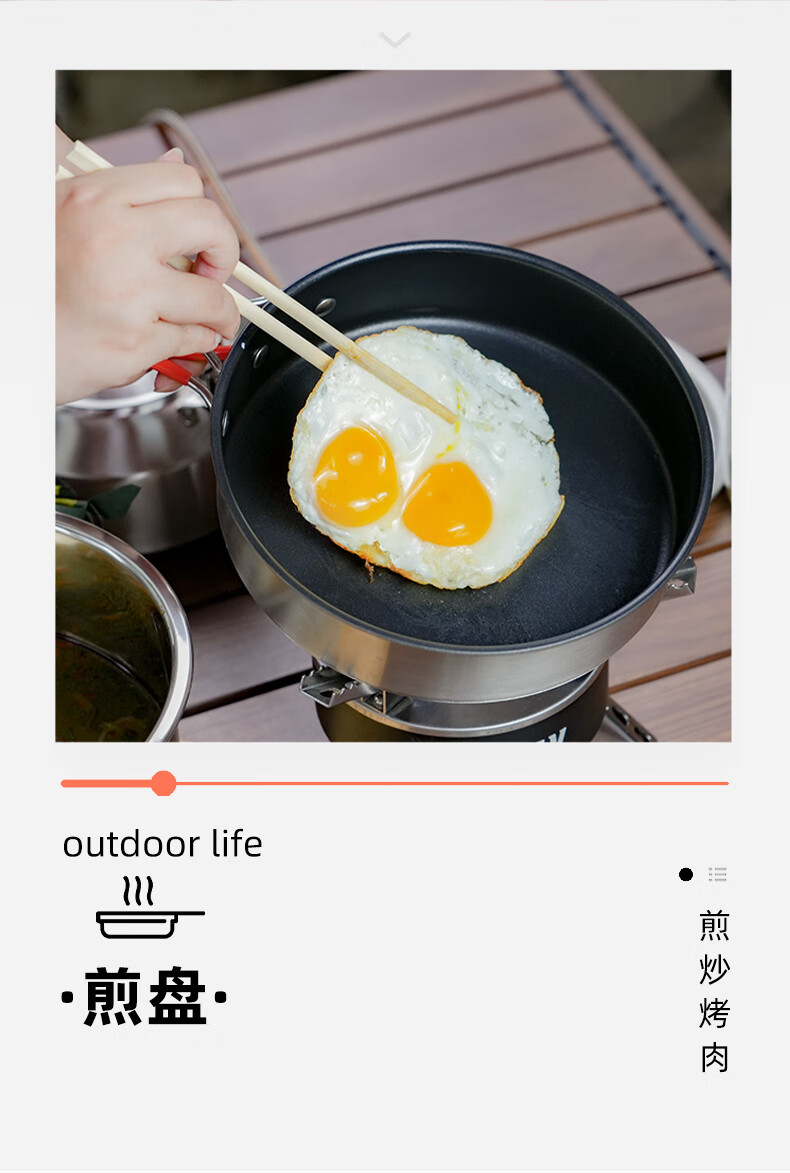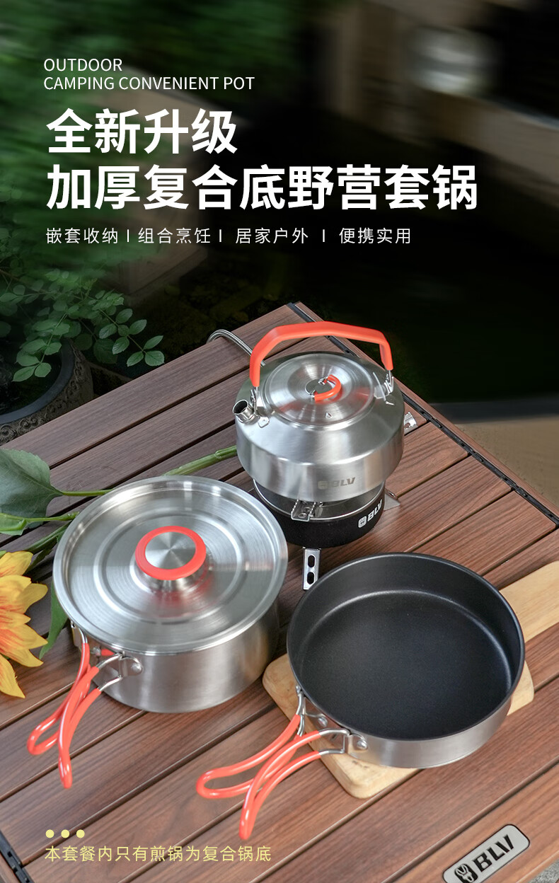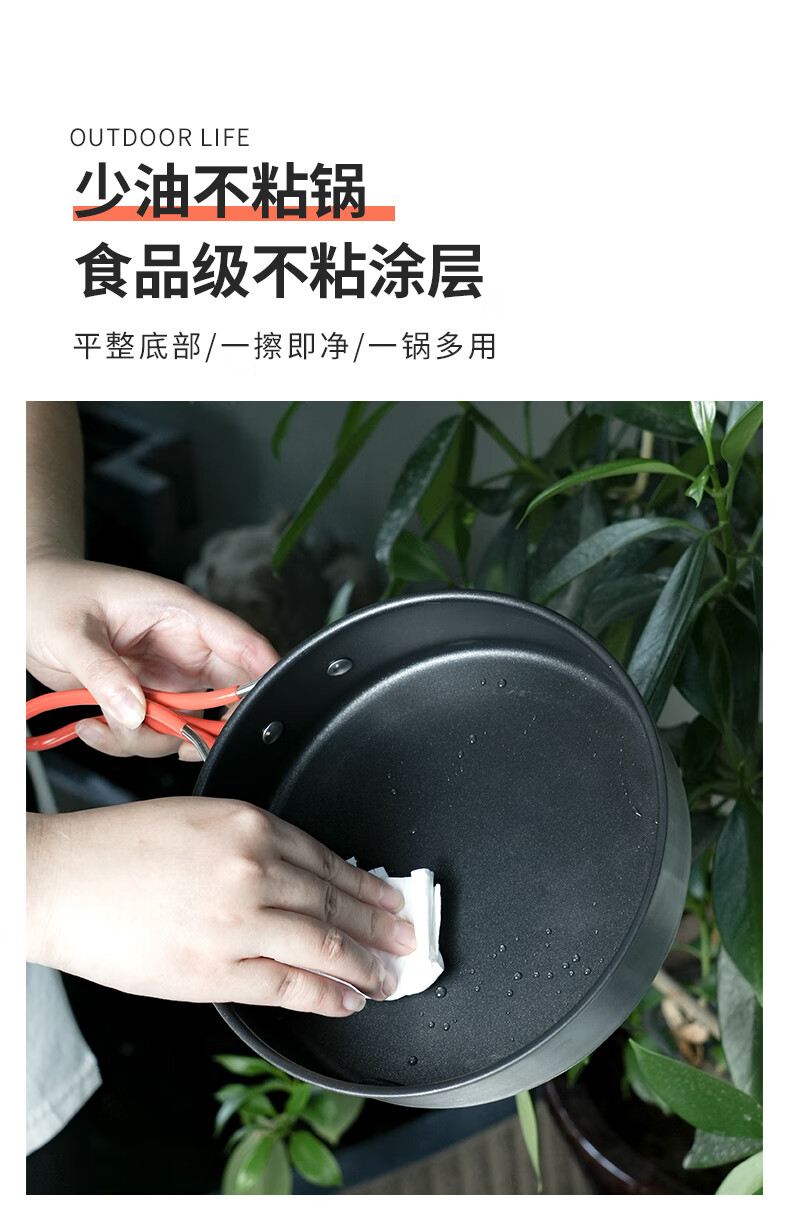 设计也很贴心,锅柄可以折叠,收纳时更省空间,而且握着不烫手。一套里面煎锅、煮锅、小奶锅都齐了,两个人露营煮个火锅、煎个牛排、煮碗热汤完全够用,清洗起来也方便,用湿巾擦一下基本就干净了。