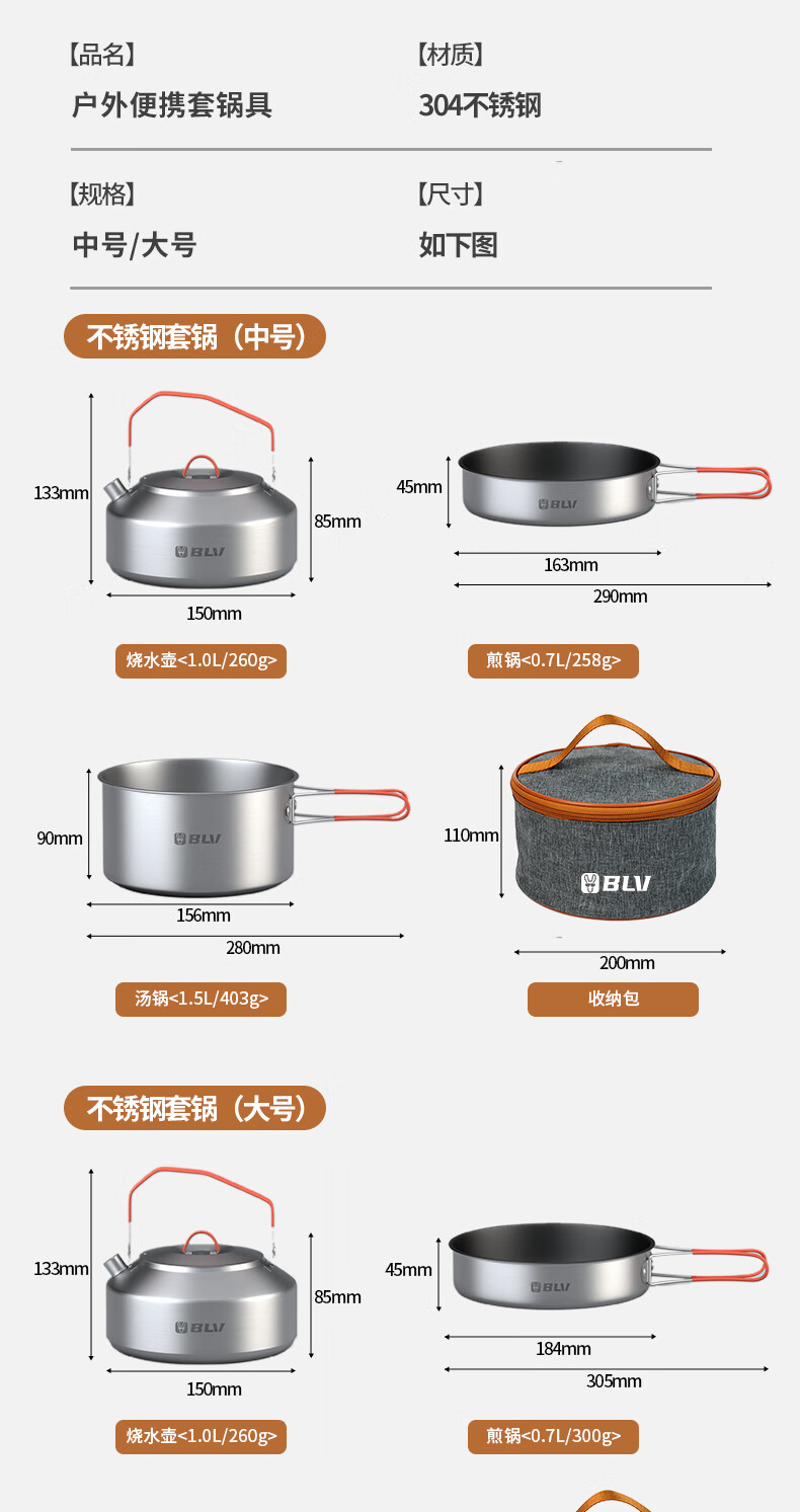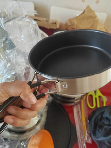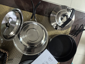 锅身材质厚实无异味手把牢固承受力强制作精良品质好,当然最看中的是不锈钢材质火炉微波炉电炉都能煮,套叠收纳方便旅游携带,家用也没问题。选了大号容量的套装,煮两个人吃的食材,觉得汤锅是基本够用了,美中不足是炒锅稍觉容量不够大需要分几次炒,最好能做再深一点。
