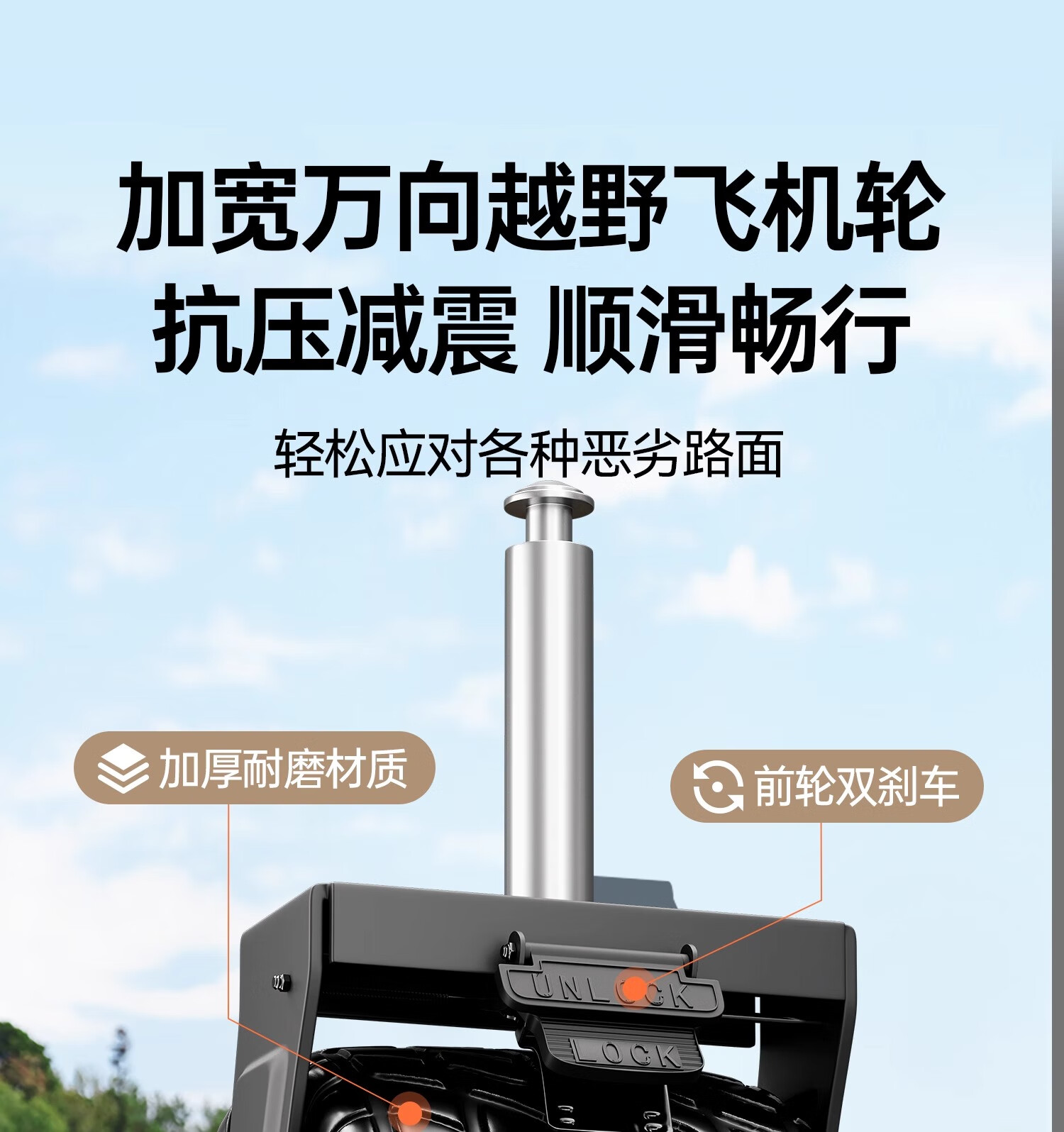 铝合金,材质厚实,非常轻便,折叠方便。建议:拉杆支架改为可调,展开去轮后可置于车后备箱当储物箱用,一举多得。当前展开后拉杆支架会撑住地面,使箱子放不平整。