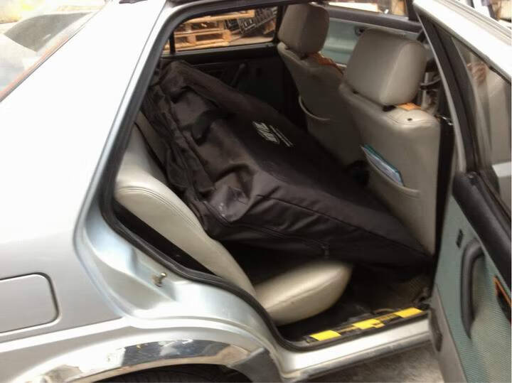 这是双人折后装入(捷达车型)后排座的效果,空间还是很大的哟,还是可以坐人的,当然你也可以把它放到行李架上,另如果你的后备箱小于1.25米只有放到后排座。