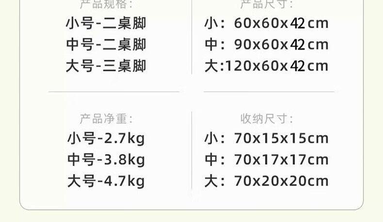 桌子不错!!质量很好!!收纳方便!!安装简单!!携带方便!!重量还可以!!管子厚度合适!!桌面大气!!主要价格实惠便宜!值得推荐购买!我