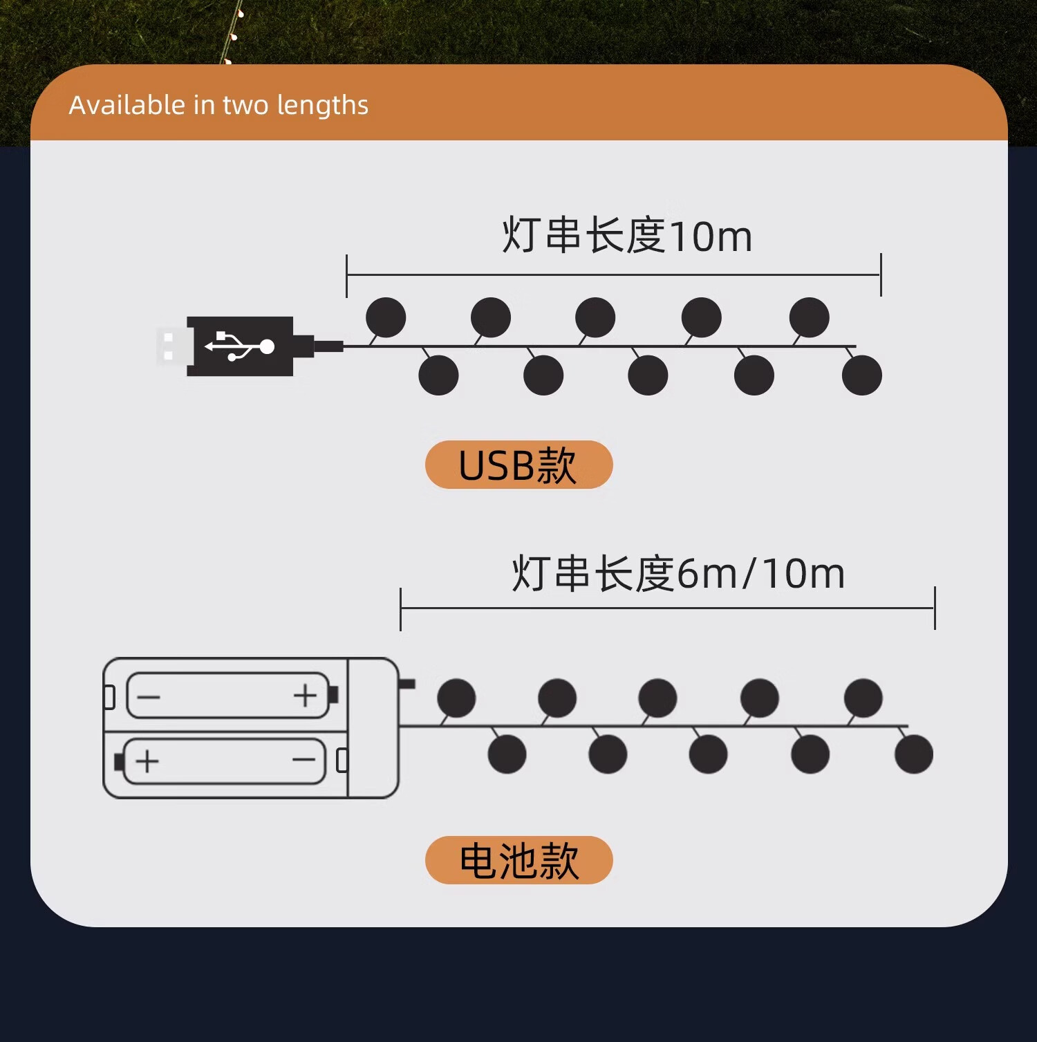 买之前一直纠结长度,不过幸好还是选择了10m,长度正好够围绕帐篷,氛围感拉满。买的电池款,使用起来很方便,收纳也比较容易,还不错