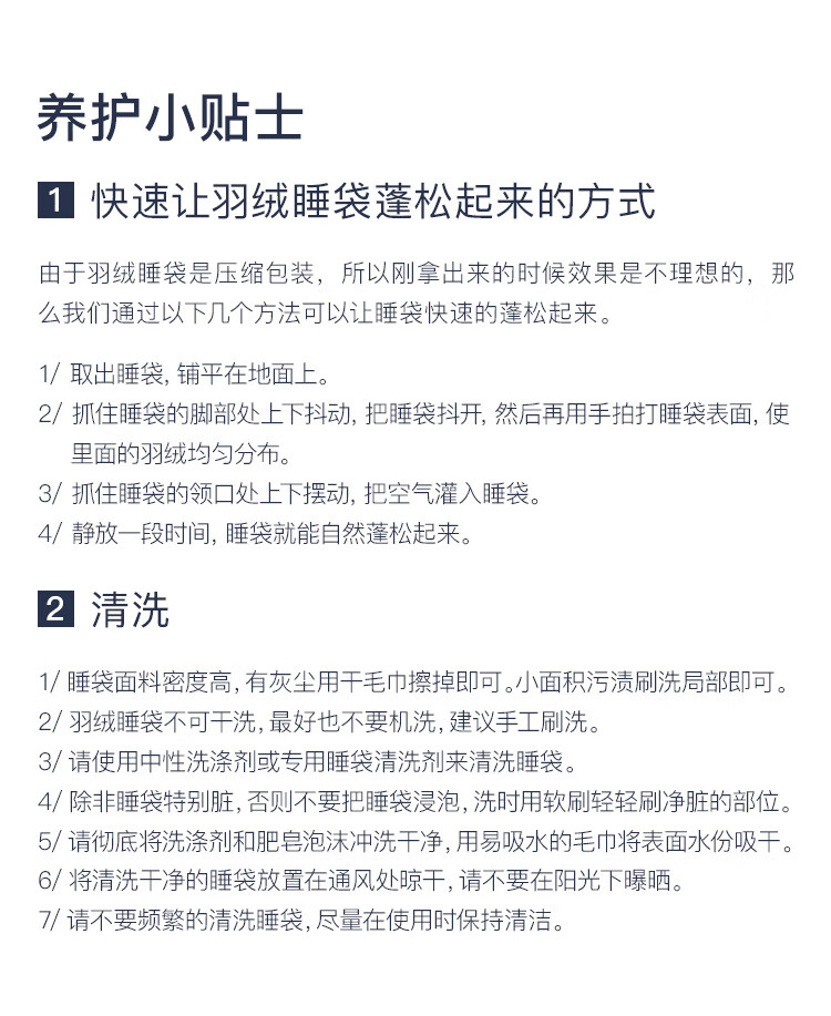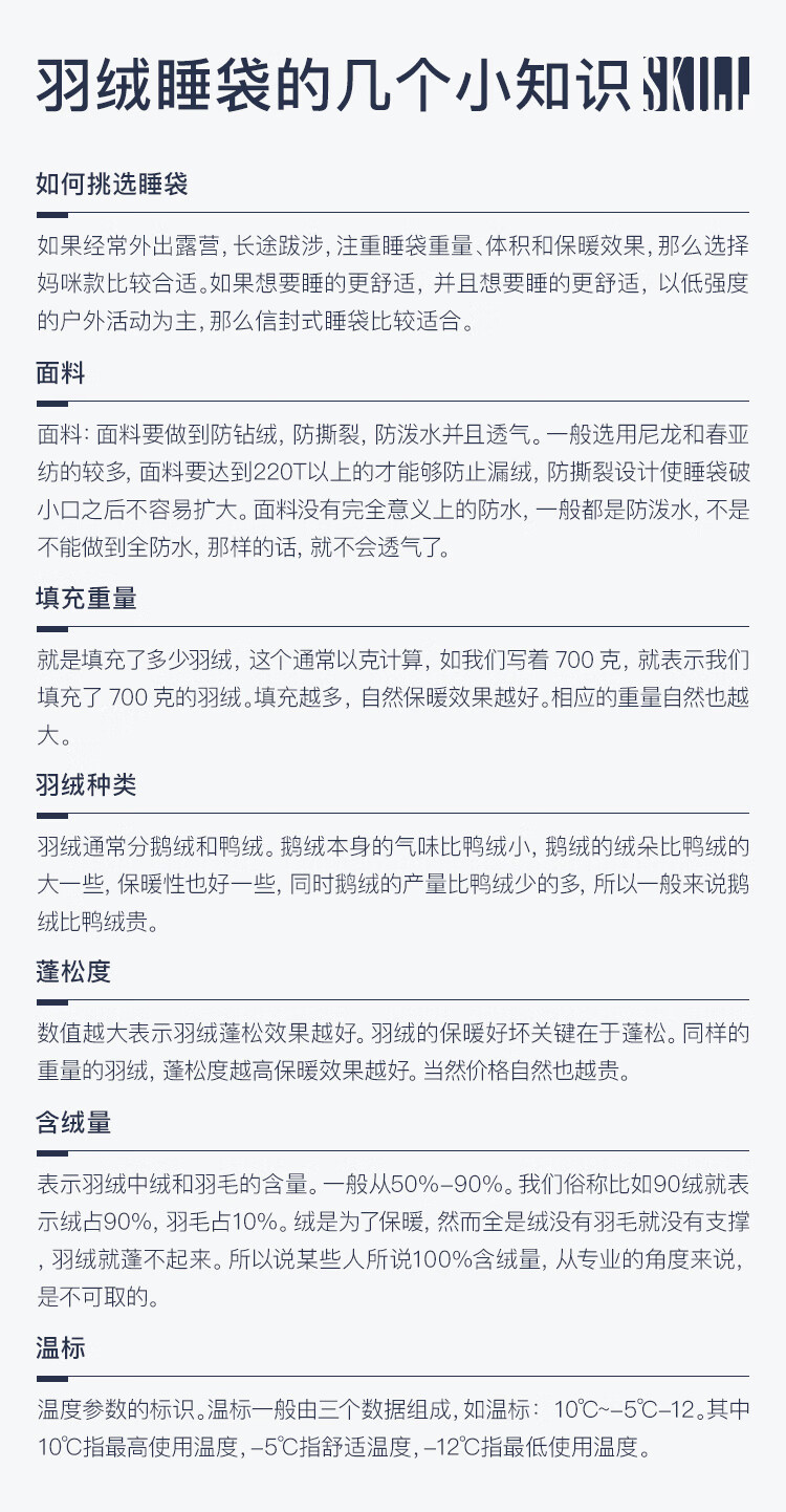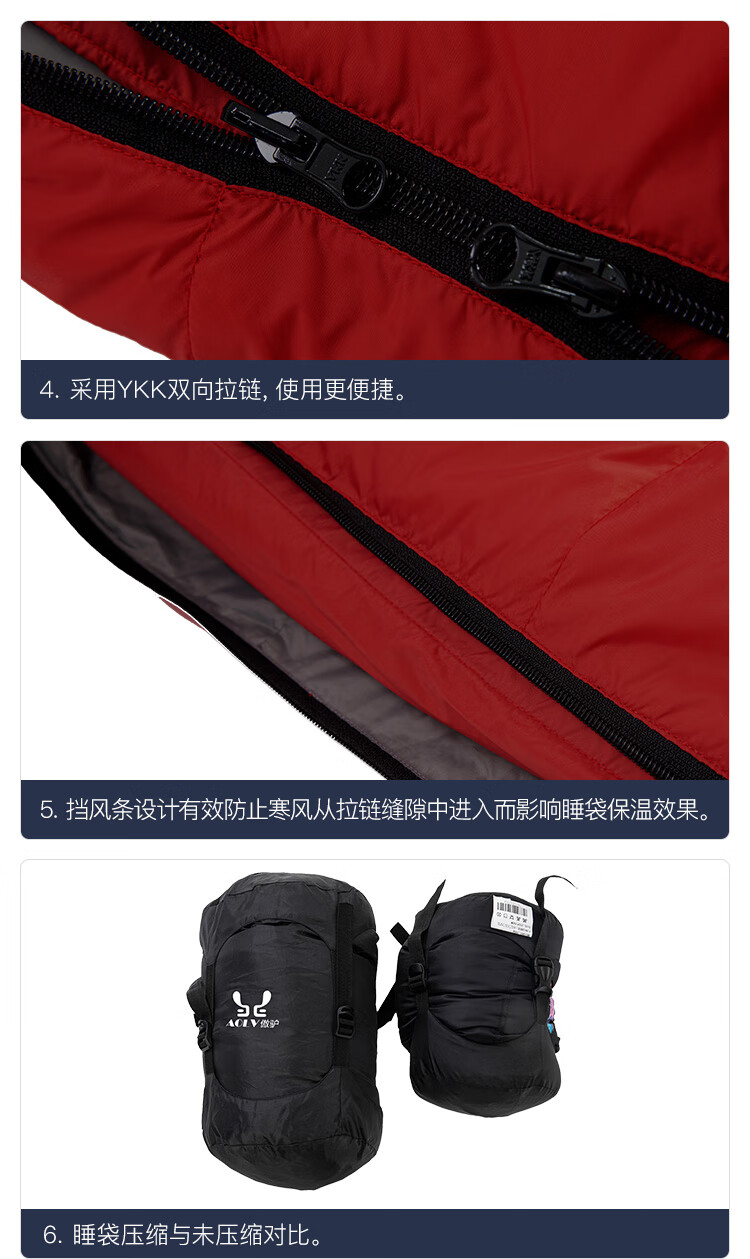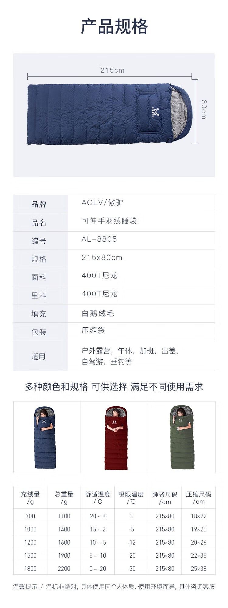 说实话,他这个产品真的很差劲,首先,第一,做工相当的差,缝线也相当的差,第二,填充的这个绒,个人感觉不是鹅绒,第三,它这个保暖效果根本达不到负20度的效果,最多也就是负10度,第四,他这个产品很薄,为什么会说它薄呢?它那个绒不均衡,会揉成一团,然后有的地方就是空空的,什么都没有,所以会很冷,第四,每天早上睡了起来,全身上下都是那个绒,第五,它外面也会跑出这个绒来