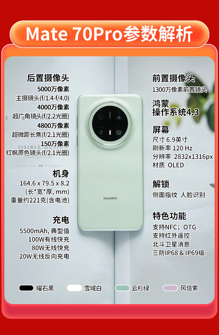 华为(HUAWEI)mate70pro 新品旗舰手机 云杉绿 12+512GB 官方标配