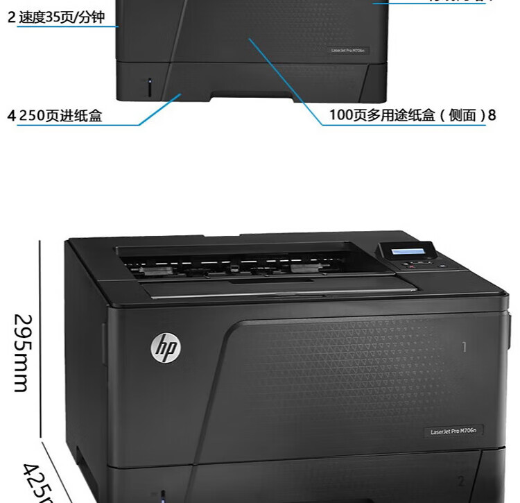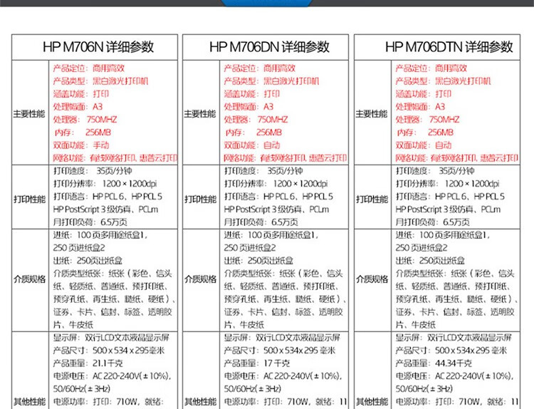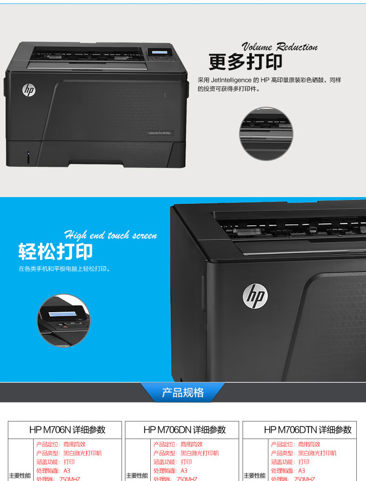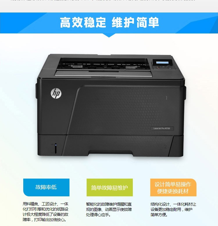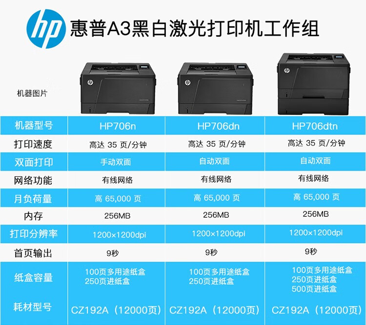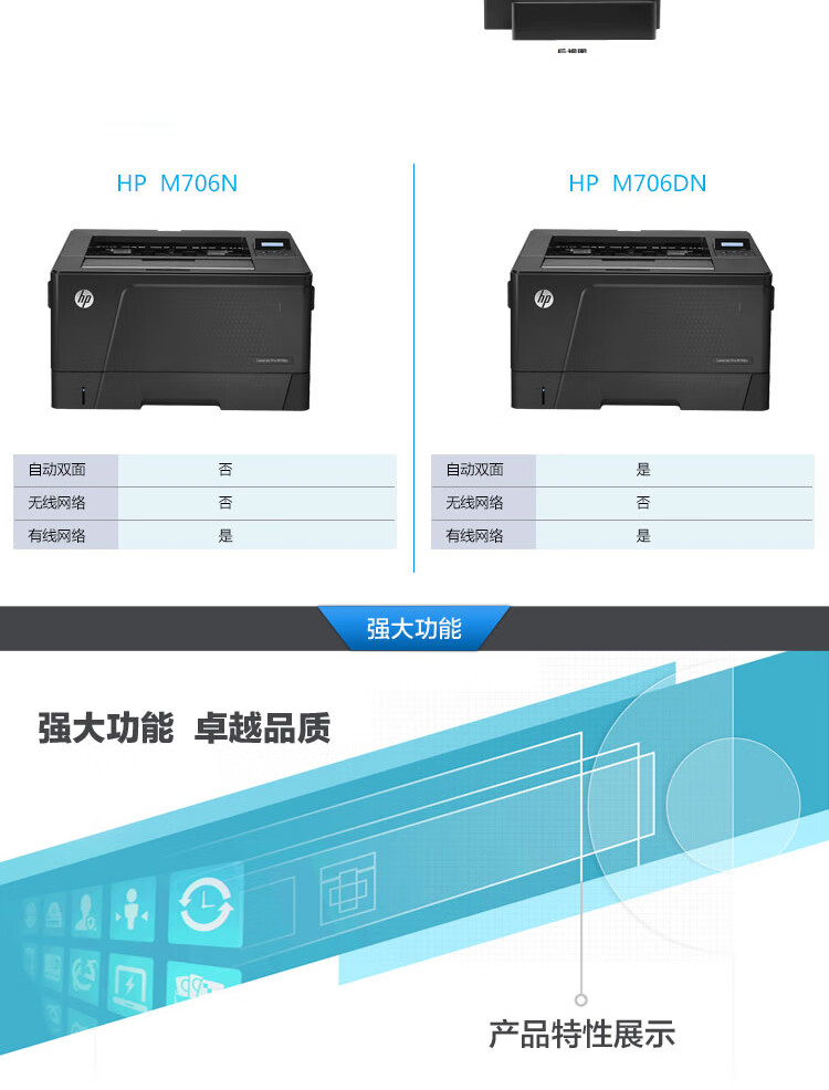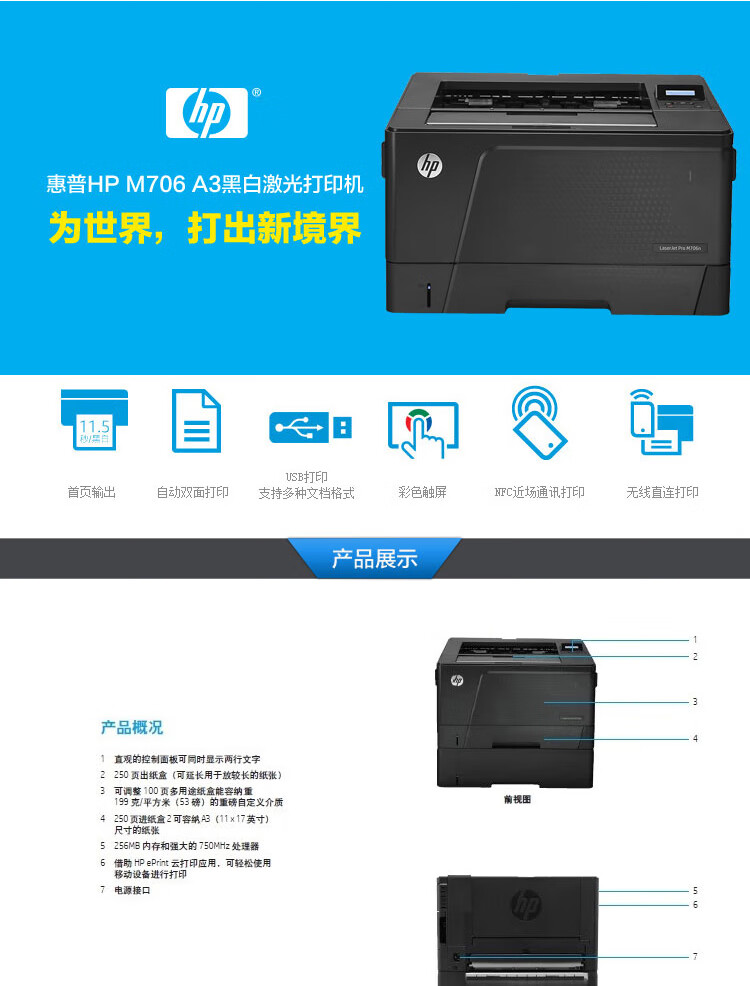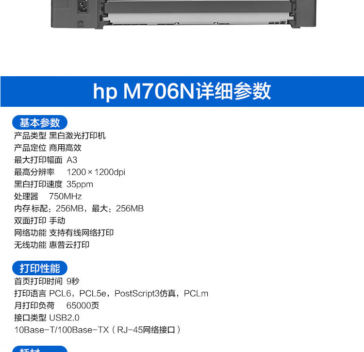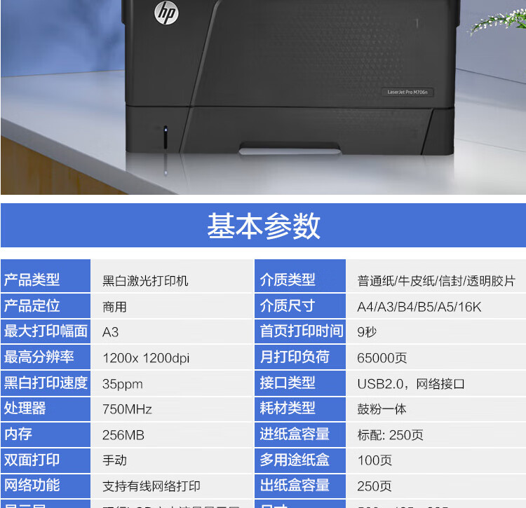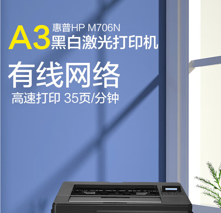 惠普(HP)M706dn 706dtn 706n A3/A4 黑白激光单机打印 有线网络连接 商用 M706dtn 免费安装 一年上门维修 全新原装未拆封 店铺质保一年