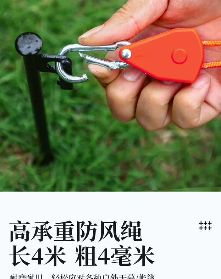 天幕赠送的防风钉比较小,每次用都不怎么牢固,特意在京东上找了这一家重新买。物流速度很快,第一天买了,第2天就到了,不耽误用。安装也是比较方便的两个人用不了20min就能弄好,绳子也比较结实,质量不错。