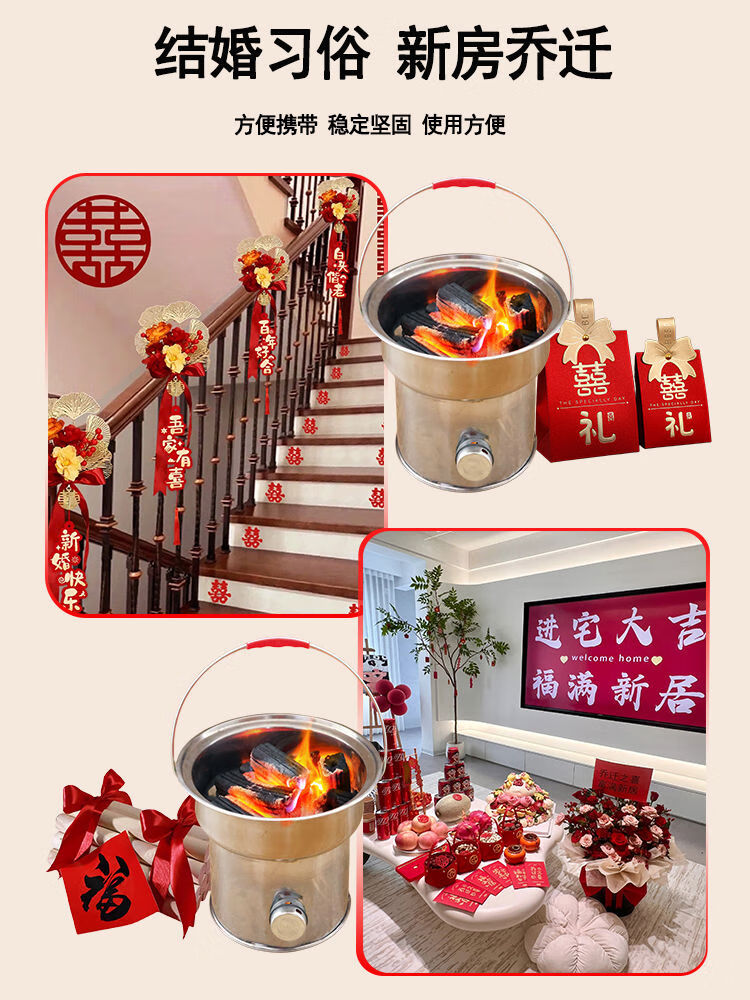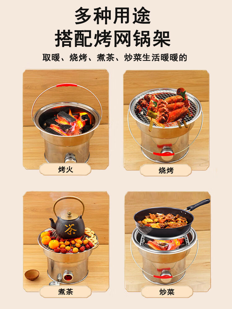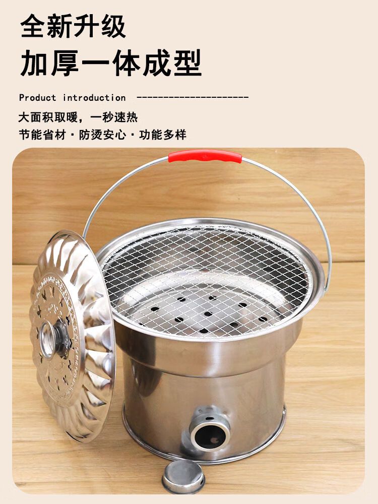 不锈钢木炭烤火炉取暖炉手提烤火盆烧烤炉架农村老式火盆户外家用 新款加厚不锈钢炭炉送烤网
