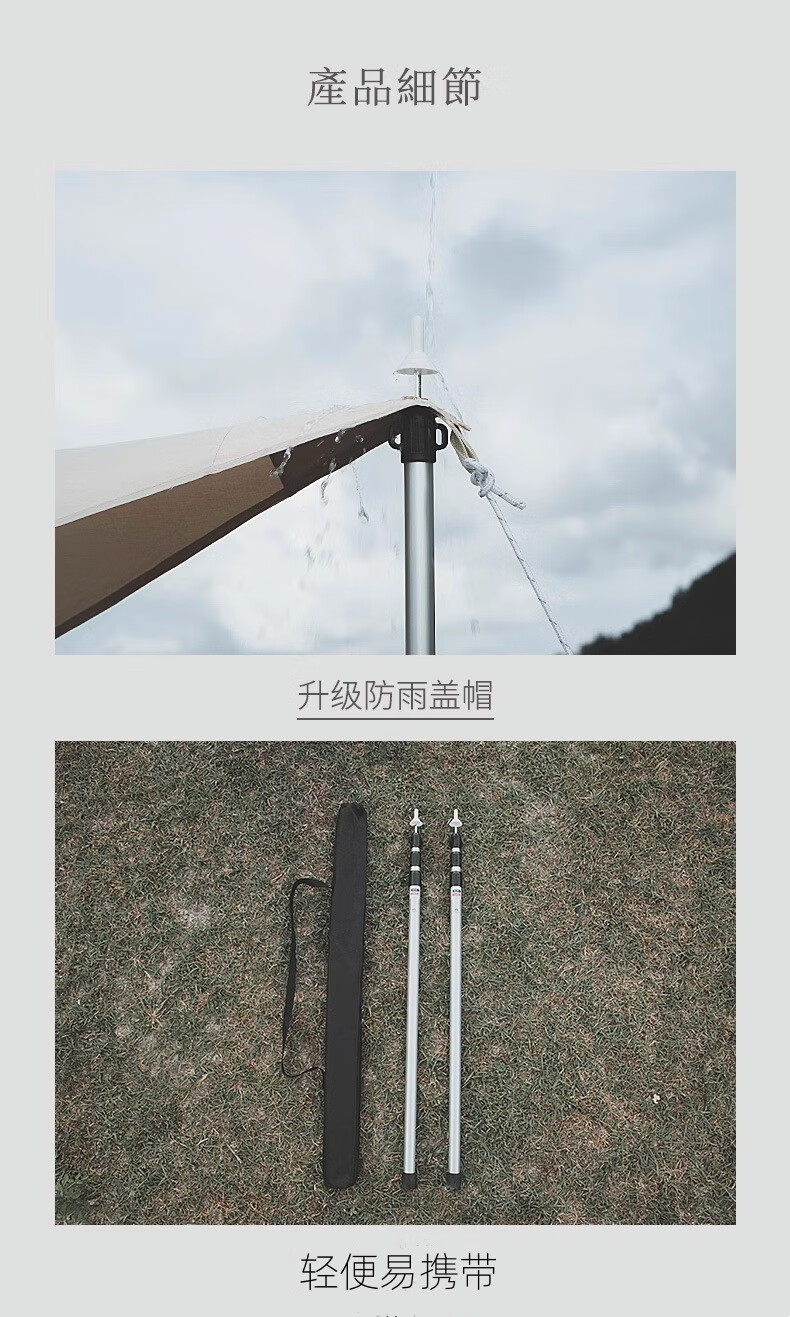 杆子很扎实,铝合金材质,顶头圆润没有毛刺,顶幕布刚好不伤面料,高度2.3米足够帐篷天幕,装卸简单方便,一拧便可,虽然没时间去浪,备着也挺好的,期待假期能去露营试试!很赞的宝贝!
