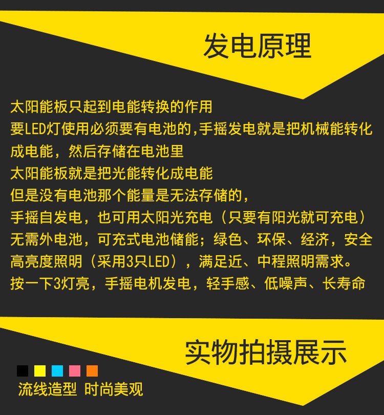 东西小巧玲珑,不依赖电源给它充电,仅靠太阳能储电或手摇发电,适合家庭、野外短暂应急照明。