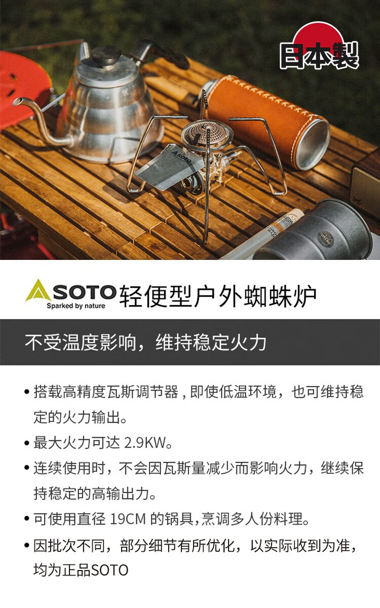 soto310户外圈里非常非常经典的一款炉头,形似蜘蛛所以又叫蜘蛛炉,炉头收纳精巧,收纳起来非常小巧,品质有保障,火力很大,出去玩煮咖啡,烧水,煮火锅轻轻松松完全没问题