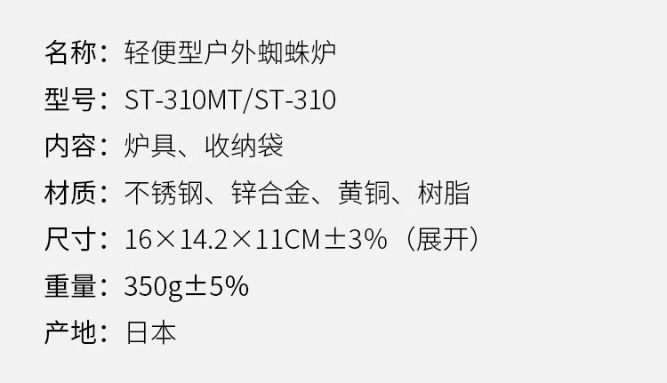 soto310慕名已久,是户外圈里非常非常经典的一款炉头,形似蜘蛛所以又叫蜘蛛炉,这款的设计精巧,而且还可折叠,收纳起来非常小巧,进口的品质有保障,火力很大,出去玩一两个人煮个面条烧个水轻轻松松完全没问题
