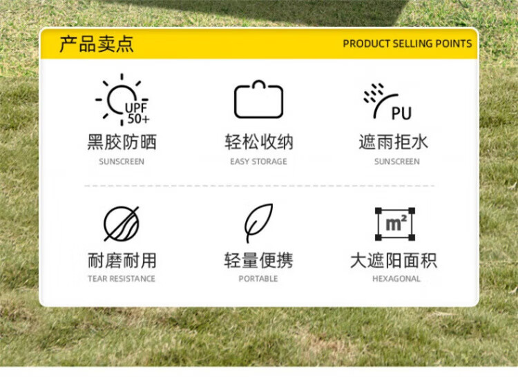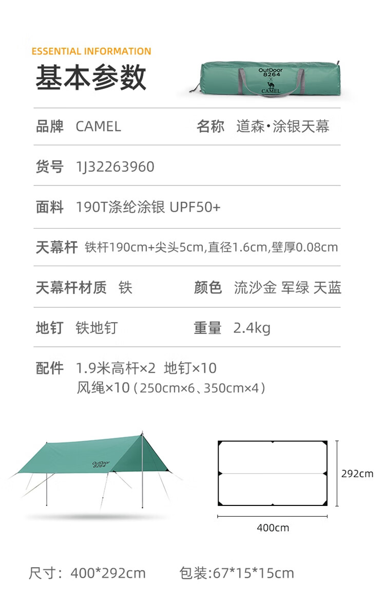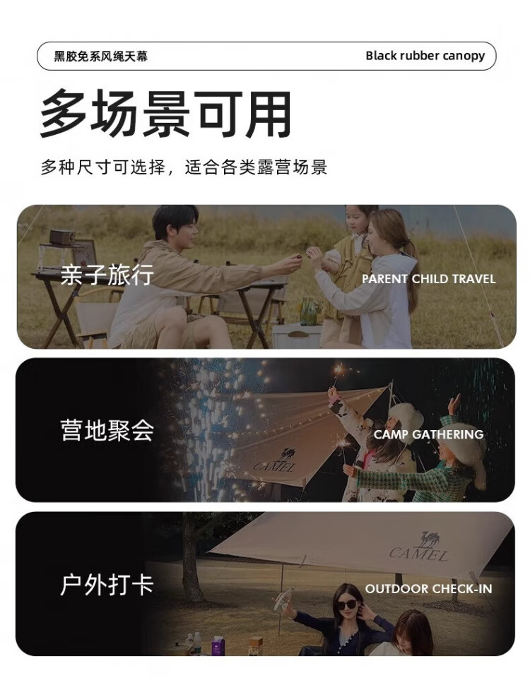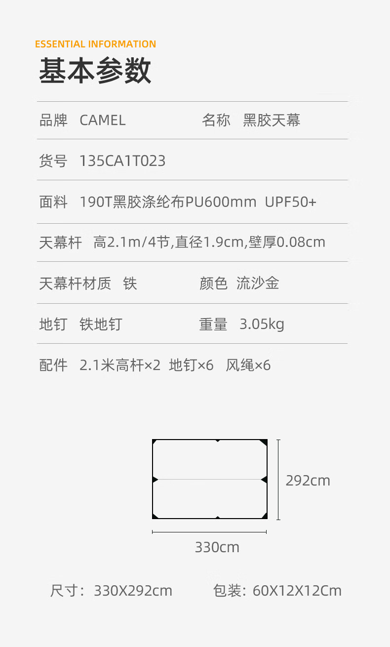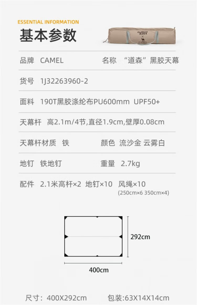 骆驼(CAMEL) 户外天幕帐篷露营野餐加厚防晒便携遮阳棚野炊公园野营防小雨棚 30㎡ 流沙金 黑胶 172BC02079B