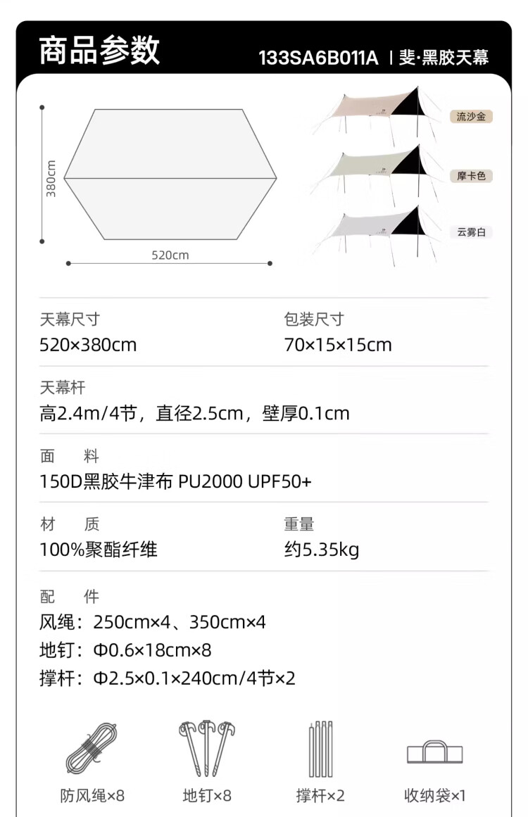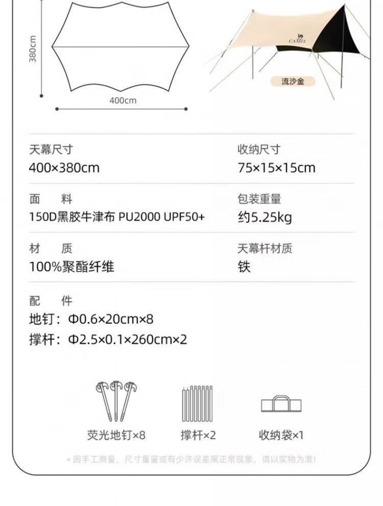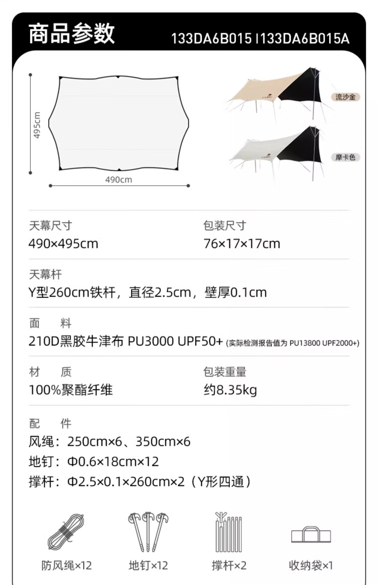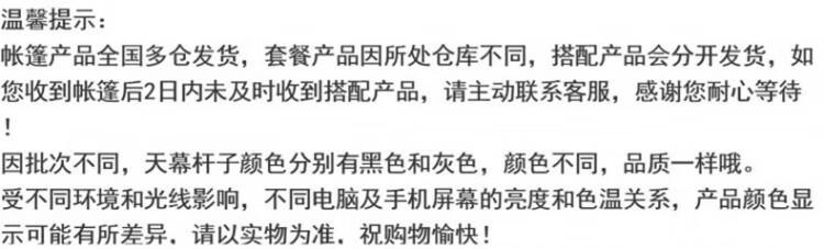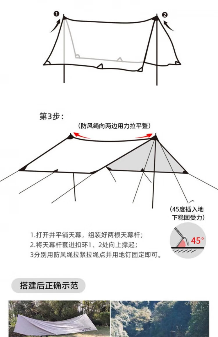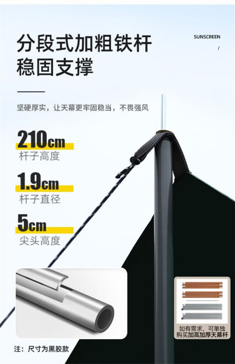 物流速度确实很快,天幕质量也很好,用着感觉不错,大小刚好适合五六个人。虽然第一次搭建时有些不熟悉,但花点时间就搞定了,以后应该就熟练了。防晒效果确实很好,下次打算再买一个帐篷搭配使用,应该会很不错。总体来说非常满意!