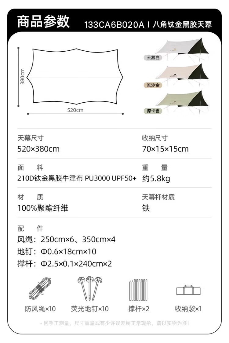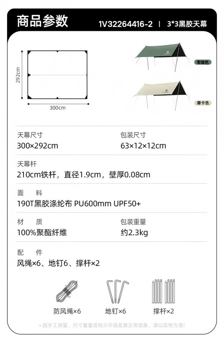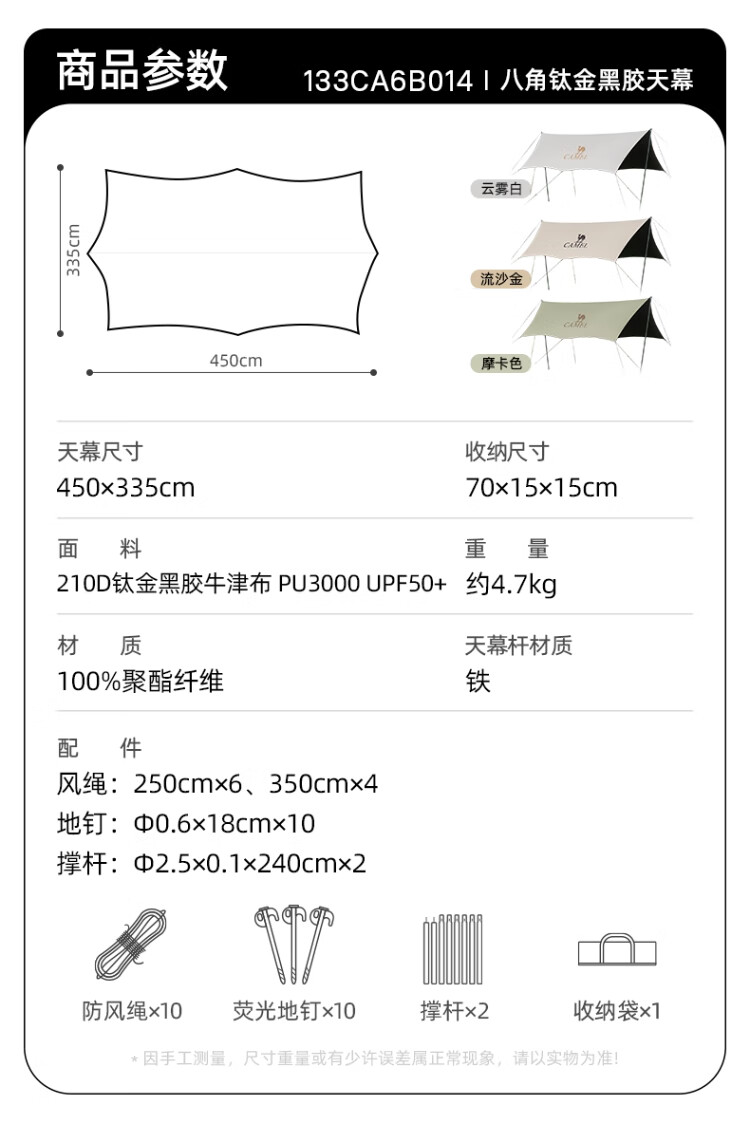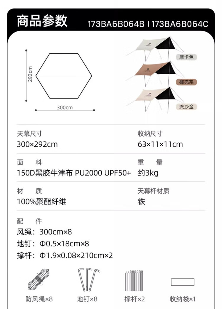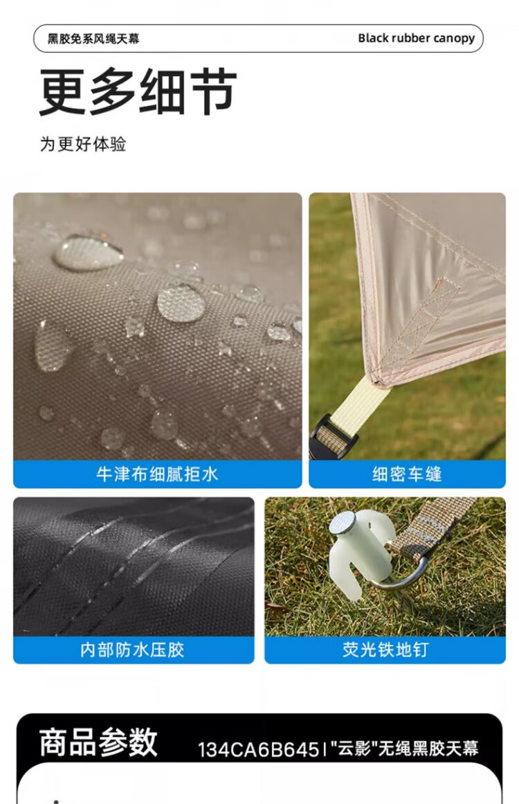 质量很好,买了一车骆驼户外装备了,这个天幕挺实的,里面地钉那些配件也都有,好评