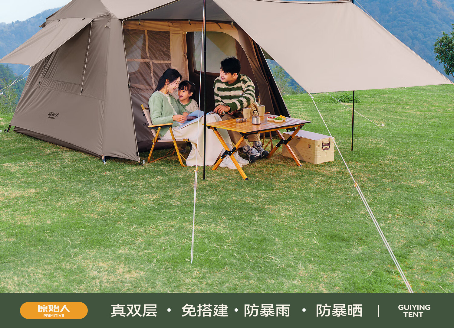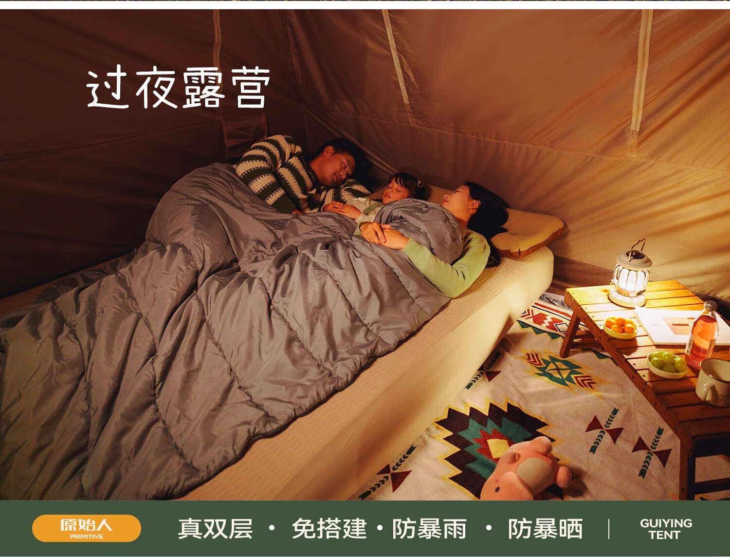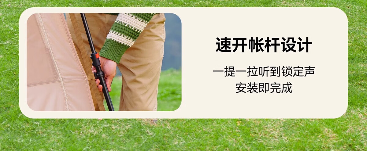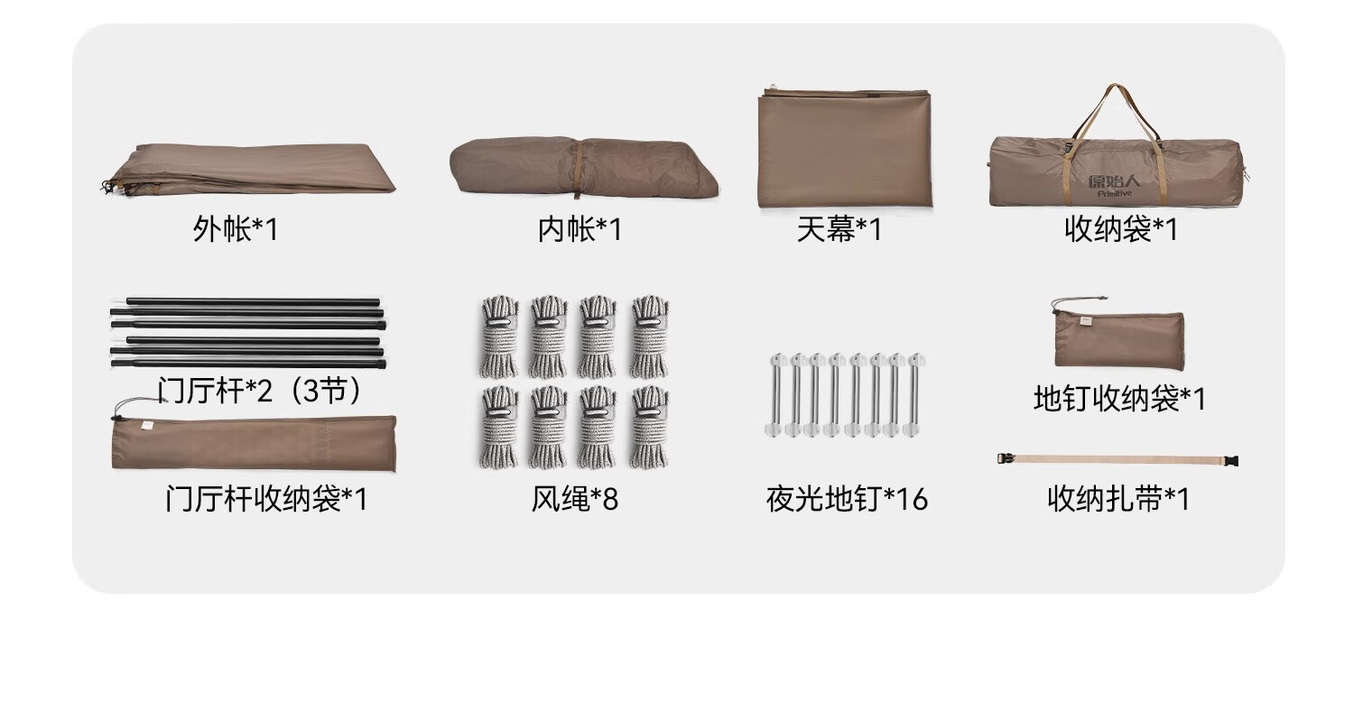 闭眼冲!原始人露营套餐承包了我所有户外快乐✨ 作为露营新手,选套餐时对比了好多家,最终入手原始人这套真的太明智了!整套包含天幕、帐篷、折叠桌椅和全套配件,真正实现“一包搞定”,不用额外费心搭配,对新手超友好~ 最惊喜的是搭建难度为零!自动速开设计,我一个女生十几分钟就搭好全套,撑开帐篷一提一拉瞬间成型,风绳和地钉的安装也简单易懂,完全不用喊人帮忙。材质质感远超预期,天幕是升级黑胶涂层,UV阻隔率超高,正午暴晒时帐内温度明显低好几度,防晒力堪比专业遮阳伞;帐篷是双层结构,外帐防水指数够高,上次露营遇小雨,全程没有渗水,内帐的细密纱网透气又防蚊,夏夜躺里面能伴着风鸣入睡,完全不闷热。 空间也超够用!2-3人帐篷容纳两大一小绰绰有余,放了充气床和行李后还能自由活动,站在里面不会压抑;搭配的折叠桌椅刚好适配天幕,不管是野餐喝茶还是陪孩子做游戏都很惬意,桌椅承重扎实,坐上去稳稳当当。收纳也超省心,整套打包后体积小巧,重量轻便,自驾放后备箱完全不占地,折叠时跟着教程练两次就熟练了,一点不费劲。 到手后没有刺鼻异味,细节做工也很到位,加粗支架抗风性不错,户外遇到微风完全不会晃。