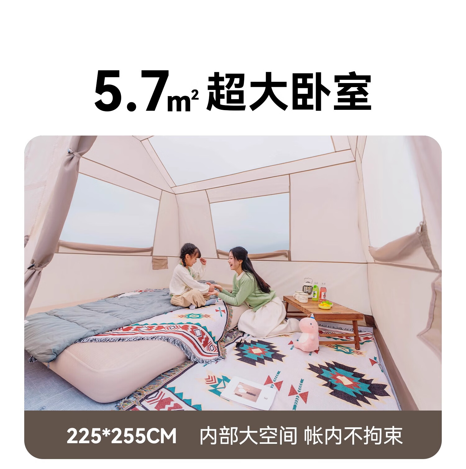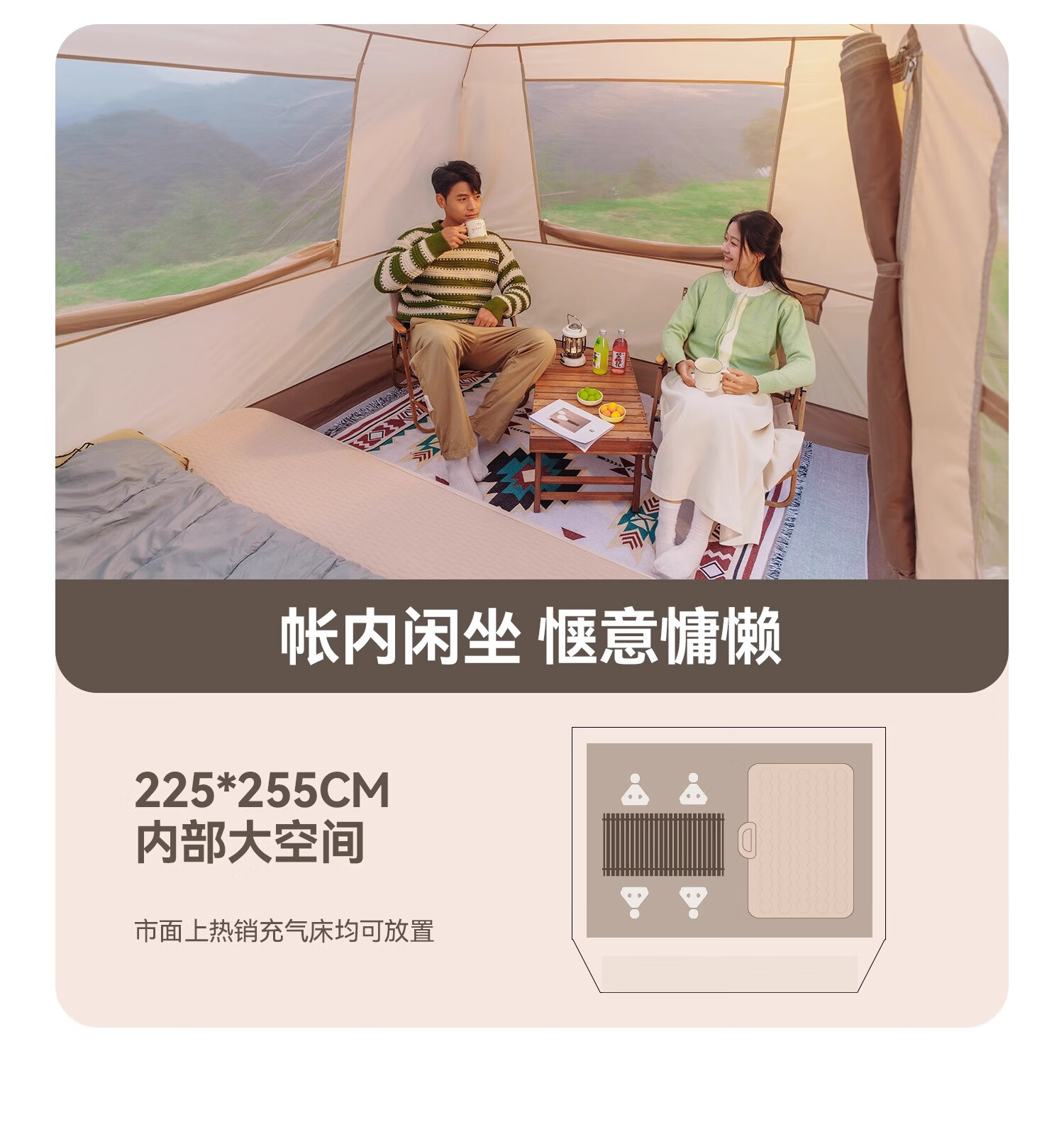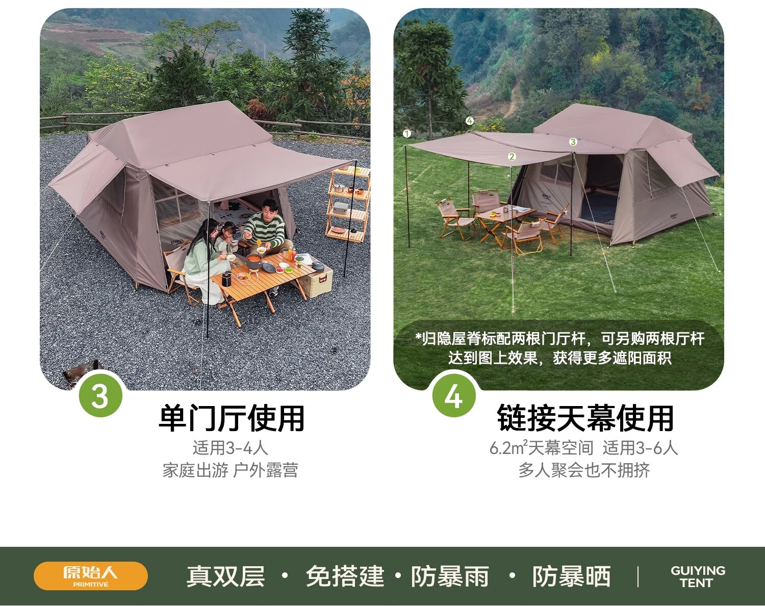 闭眼冲!原始人露营套餐承包了我所有户外快乐✨ 作为露营新手,选套餐时对比了好多家,最终入手原始人这套真的太明智了!整套包含天幕、帐篷、折叠桌椅和全套配件,真正实现“一包搞定”,不用额外费心搭配,对新手超友好~ 最惊喜的是搭建难度为零!自动速开设计,我一个女生十几分钟就搭好全套,撑开帐篷一提一拉瞬间成型,风绳和地钉的安装也简单易懂,完全不用喊人帮忙。材质质感远超预期,天幕是升级黑胶涂层,UV阻隔率超高,正午暴晒时帐内温度明显低好几度,防晒力堪比专业遮阳伞;帐篷是双层结构,外帐防水指数够高,上次露营遇小雨,全程没有渗水,内帐的细密纱网透气又防蚊,夏夜躺里面能伴着风鸣入睡,完全不闷热。 空间也超够用!2-3人帐篷容纳两大一小绰绰有余,放了充气床和行李后还能自由活动,站在里面不会压抑;搭配的折叠桌椅刚好适配天幕,不管是野餐喝茶还是陪孩子做游戏都很惬意,桌椅承重扎实,坐上去稳稳当当。收纳也超省心,整套打包后体积小巧,重量轻便,自驾放后备箱完全不占地,折叠时跟着教程练两次就熟练了,一点不费劲。 到手后没有刺鼻异味,细节做工也很到位,加粗支架抗风性不错,户外遇到微风完全不会晃。