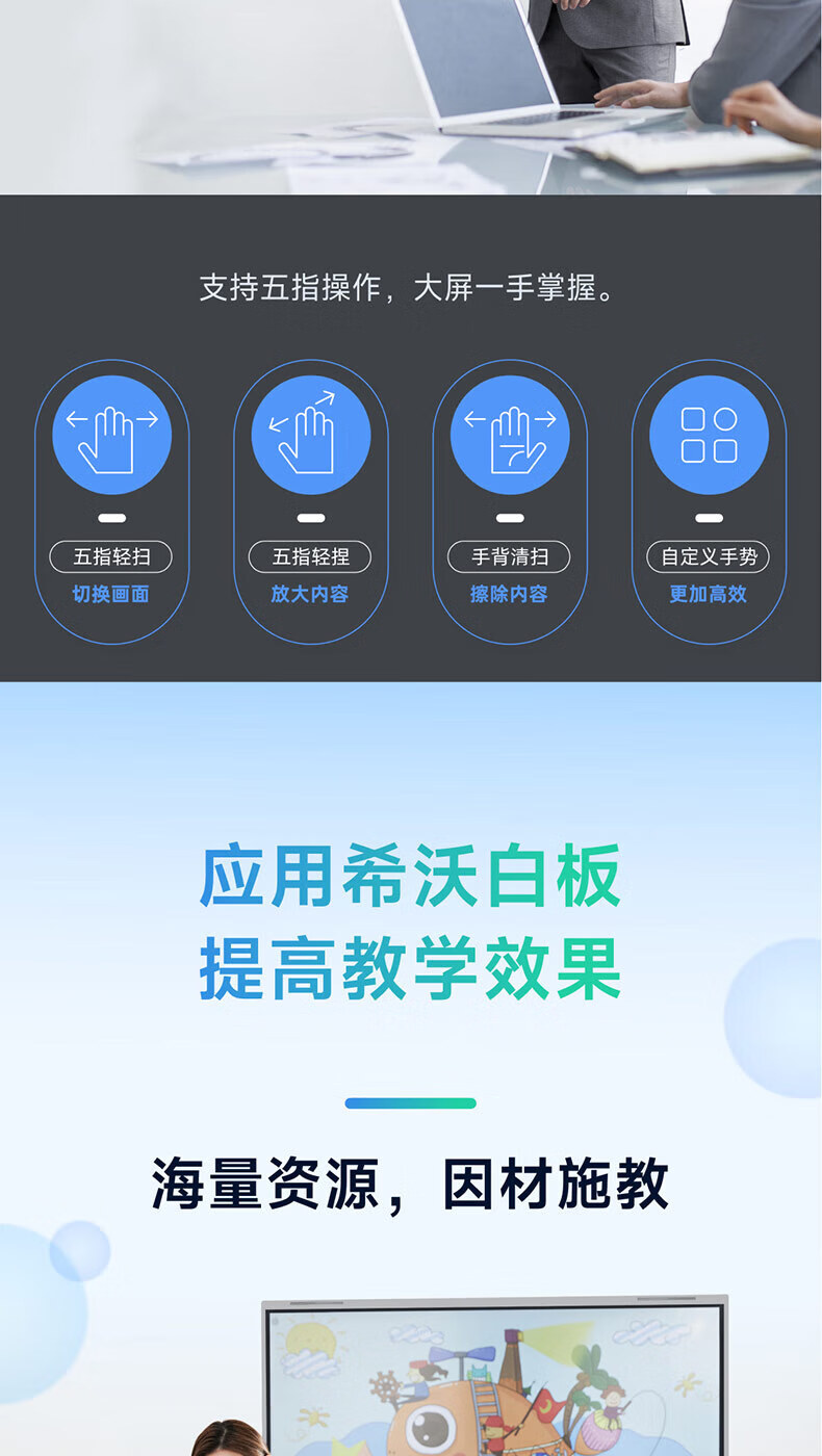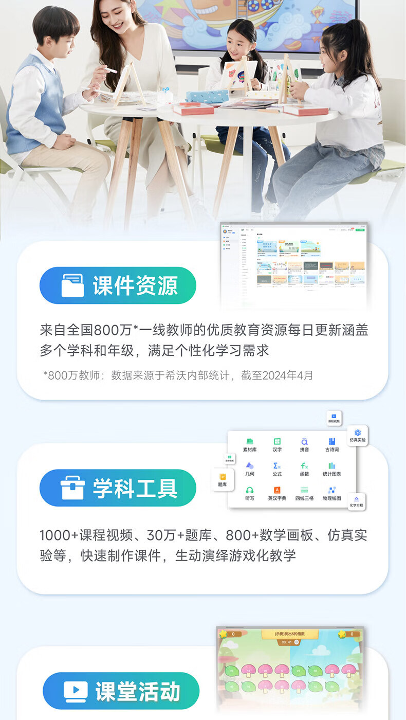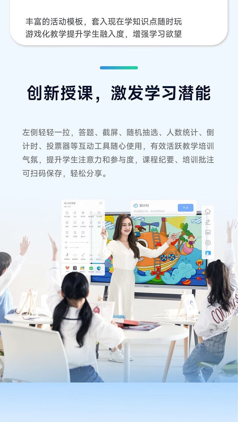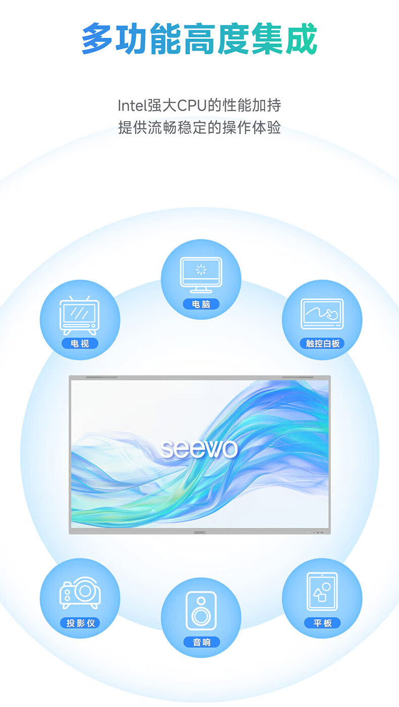 希沃一体机,触控教学新体验!高清屏幕、精准触控,海量教育资源随心调用,助力课堂高效互动,让教学更生动、更智能!简约设计,性能强劲,是教师的得力助手!