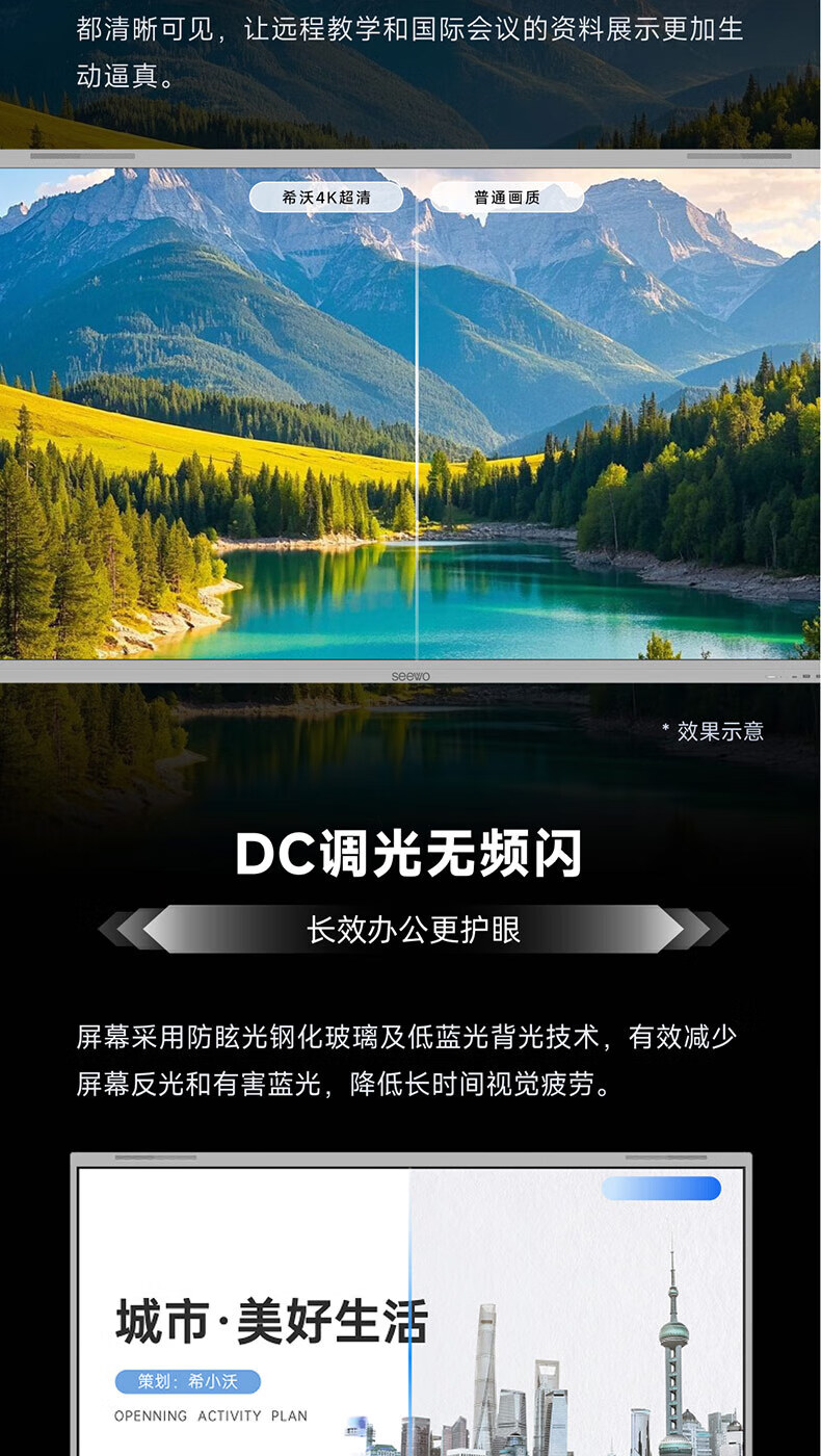新家装修,一直想给孩子买个一体机。对比之后,还是觉得希沃品牌比较好。我家4米宽客厅,装了65寸,也可以,也可以再大一点。孩子们非常喜欢。等待探索更多的功能。外观大家可以看我发的图片。安装简单,家里又多了一台大电脑,不过可以触屏,比电视爽多了!