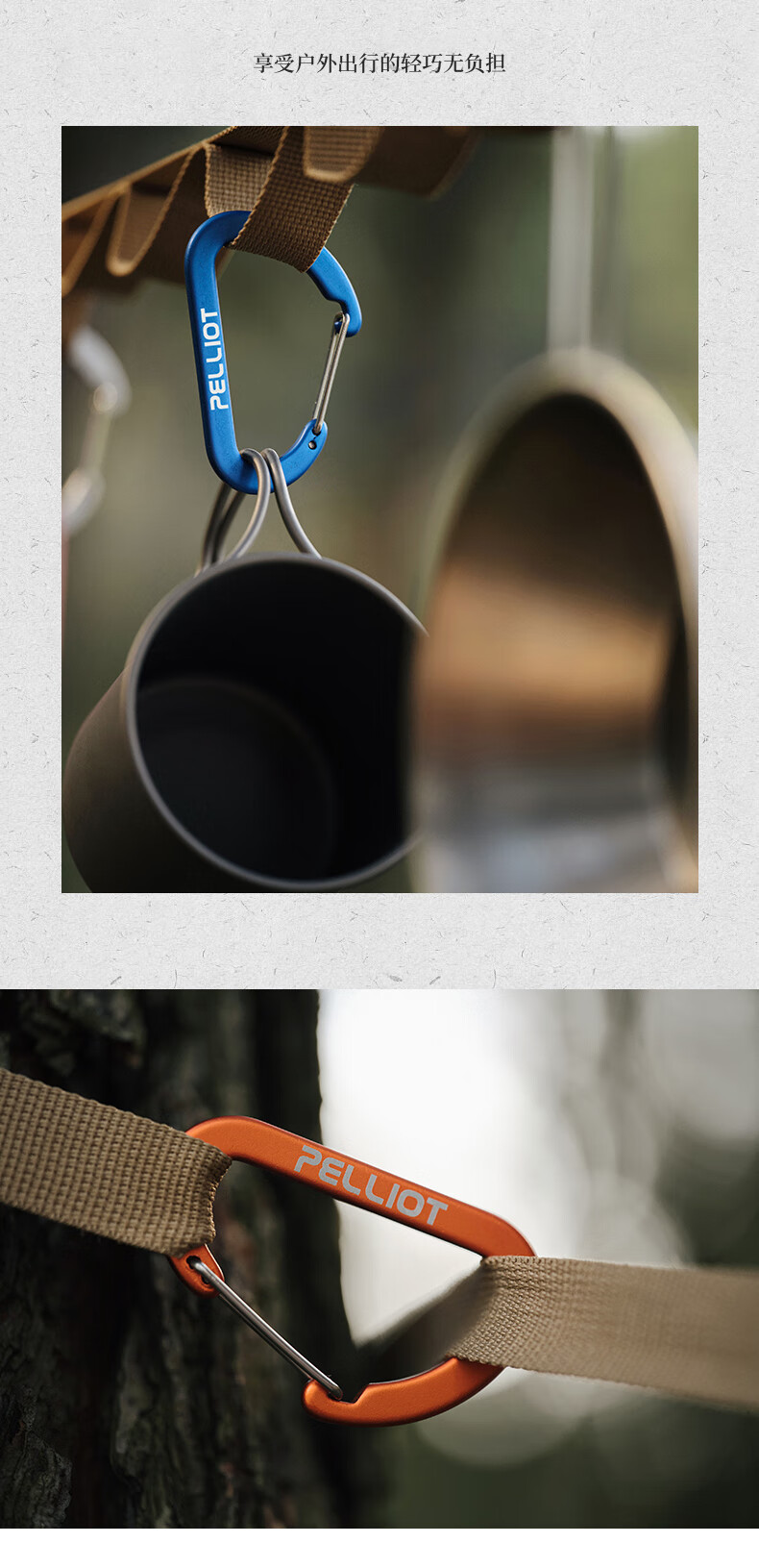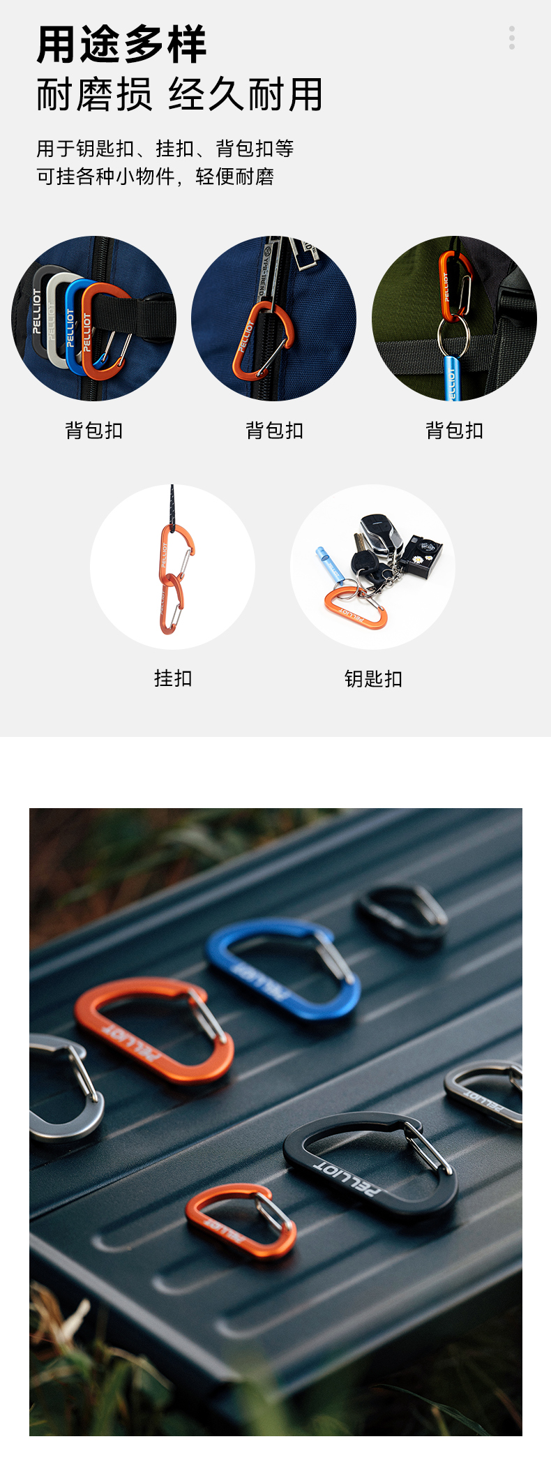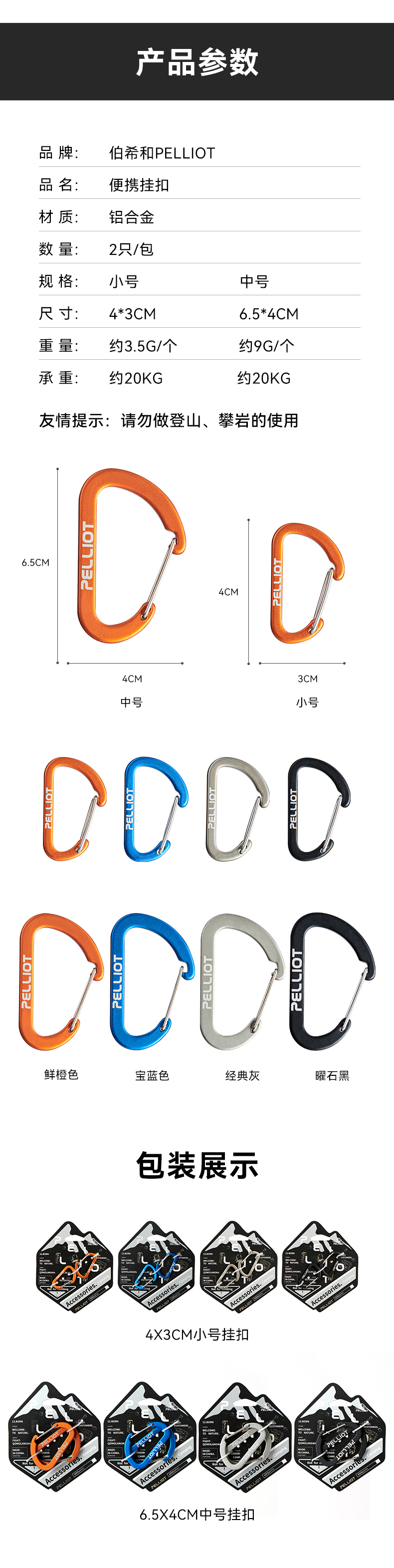 伯希和户外登山野营挂钩扣环露营徒步多用途钥匙扣餐具水杯D型挂扣 灰色 中号【2只/包】