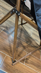 蝴蝶椅100斤坐上去蛮稳当的。木纹底架颜值过关,从关节小划痕可以看出是铝合金的材质。