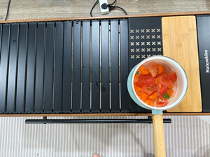 桌面是铝合金的一个蛋卷桌,可以直接放到洗碗机里去洗,非常的方便。然后我们也可以自己再定制一些不锈钢的i g t的面板,也方便扩展和打理,而且桌子拼装特别方便,非常的轻量化