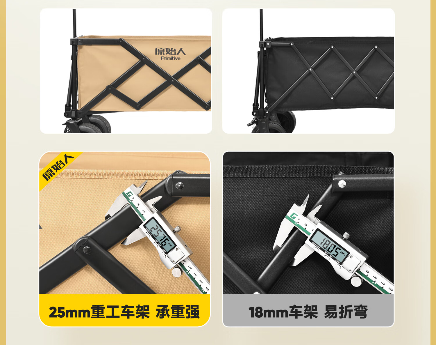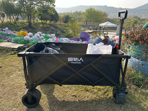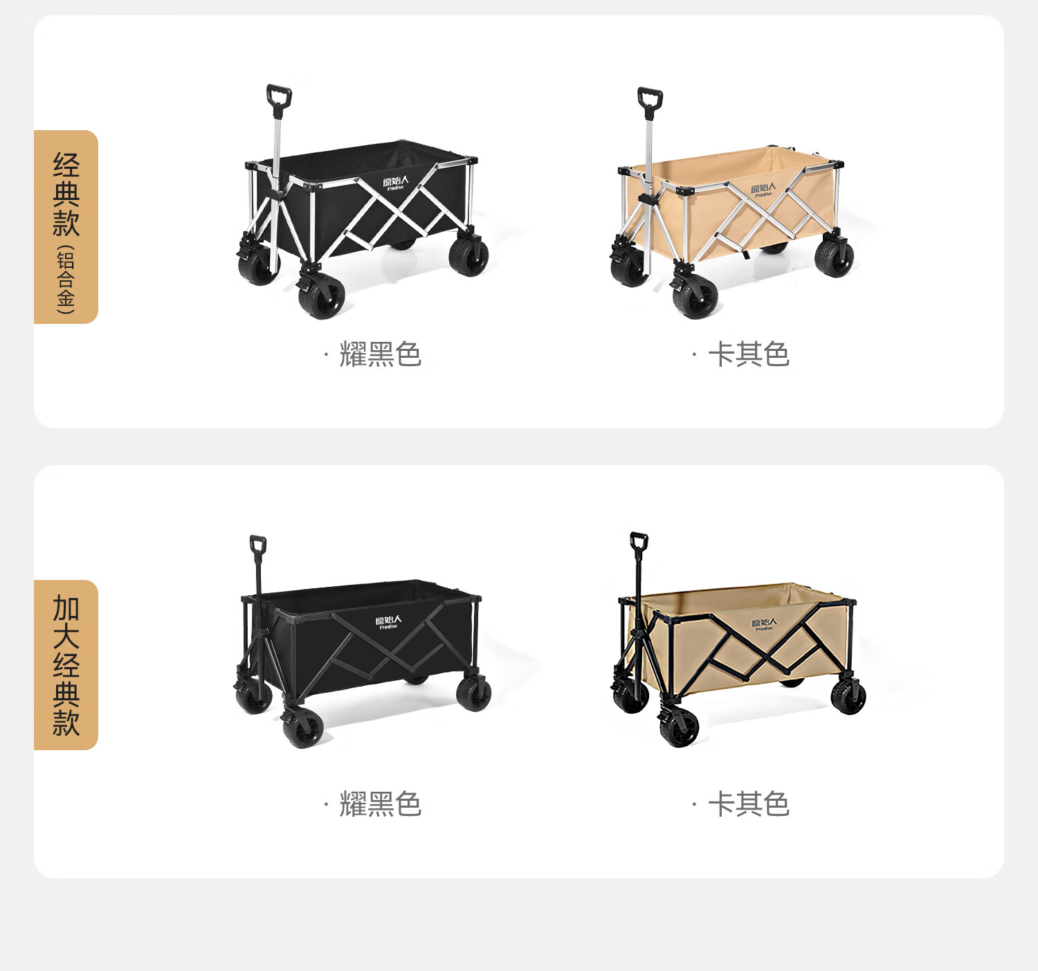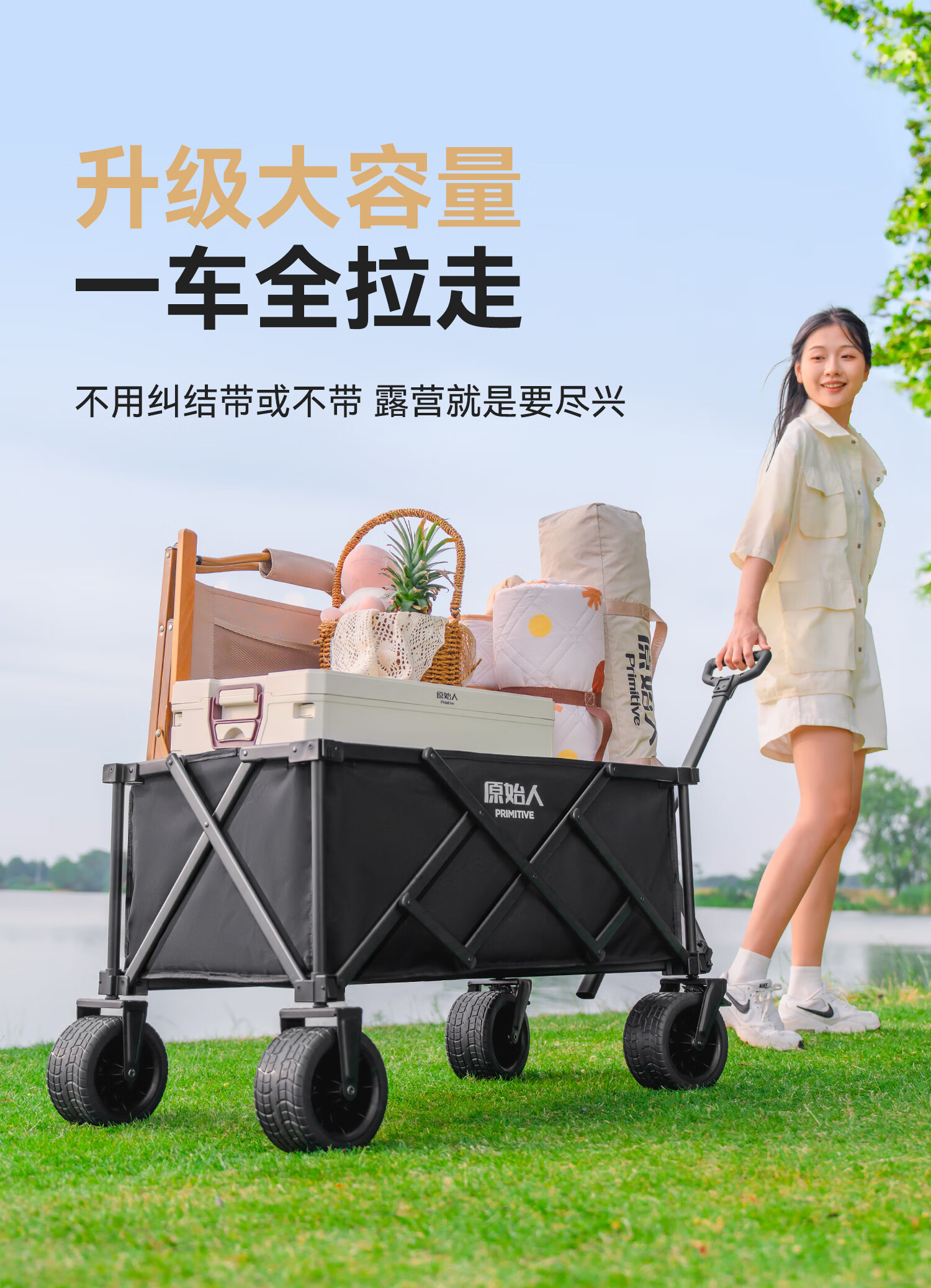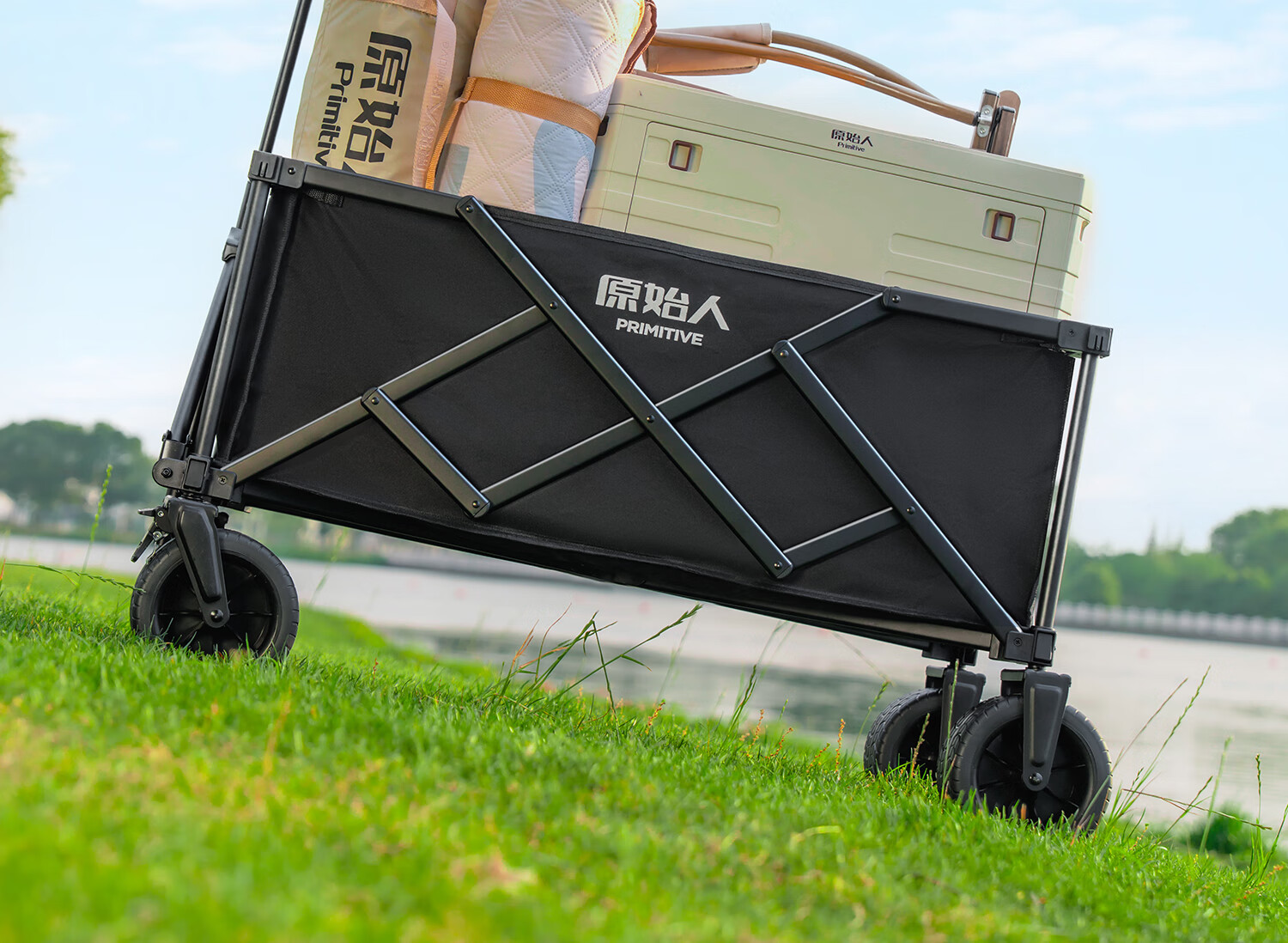 原始人好品牌户外露营车,拉杆顺畅,不卡顿,容量大,载重力很强,材质厚实,推起来非常稳当,很容易收起。小孩子非常喜欢,可以坐在里面,让我我来拉他们。