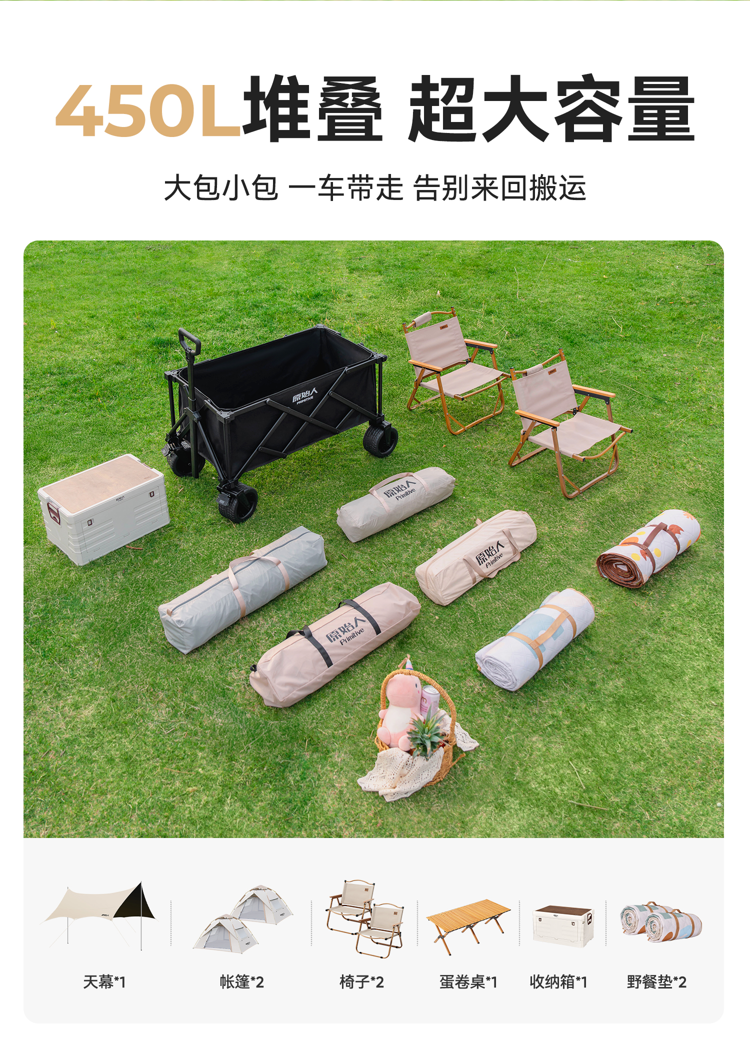 原始人露营推车户外营地拖车超大可折叠手推野餐野营手拉车小拉车 300L 顶棚套餐【越野款卡其+加厚折叠顶棚】