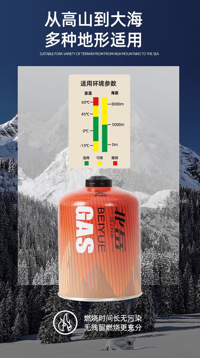 北岳 450g 高山气罐使用评价 最近入手了北岳 450g 高山气罐,整体感觉物超所值。 在高海拔地区,它的性能表现令人满意。之前去登山露营,普通气罐在低温低压环境下燃烧效率明显下降,而北岳这款气罐却能保持稳定且强劲的火力输出,让我顺利煮好了热咖啡和食物,为疲惫的身体及时补充了能量,其出色的抗寒能力确实可靠。 气罐的容量也很合适,450g 的规格,对于一次为期 2 - 3 天的露营活动来说,基本能满足烹饪需求,无需携带过多气罐,减轻了背包重量。 密封性能良好,使用过程中没有出现泄漏问题,安全性有保障。罐身的材质也比较坚固,在户外的颠簸中没有变形或损坏,让人放心。 不过,气罐的价格相比一些普通卡式炉气罐略高一点,但考虑到它在高海拔环境下的出色表现以及稳定性,这个价格还是值得的。如果你经常进行高海拔户外活动,北岳 450g 高山气罐绝对是值得信赖的选择,能为你的户外生活带来极大便利和保障。