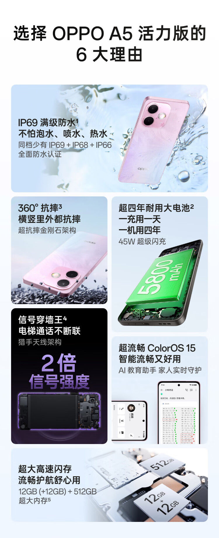OPPO 【至高减200】A5活力版新品5g全网通拍照游戏智能机IP69满级防水360°抗摔超四年耐用大电池 玛瑙粉 12GB+512GB 官方标配【全国联保+活动版】