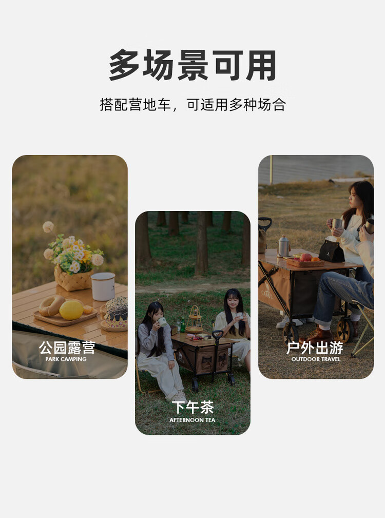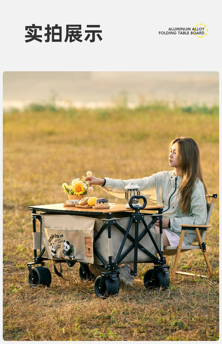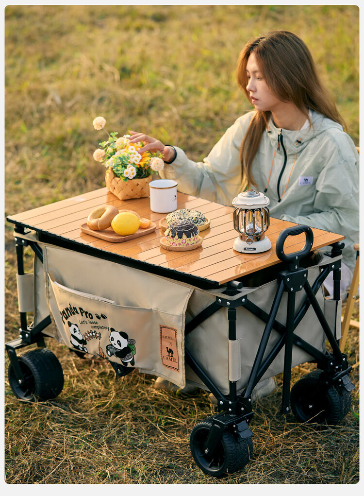 北山狼 户外露营车折叠推车 带桌板营地车野营推车大容量 米色 330L 有刹车 【原创印花】+木纹铁桌板