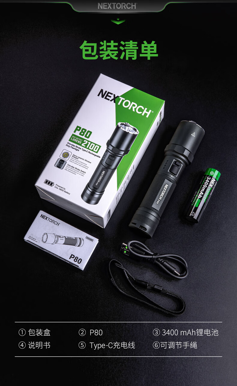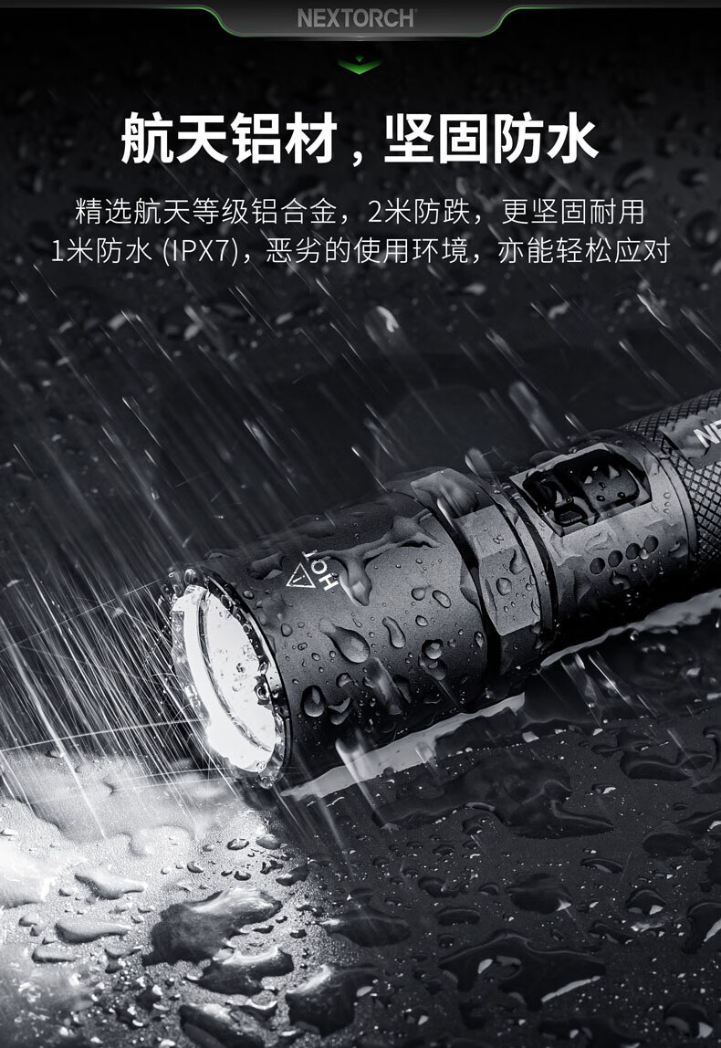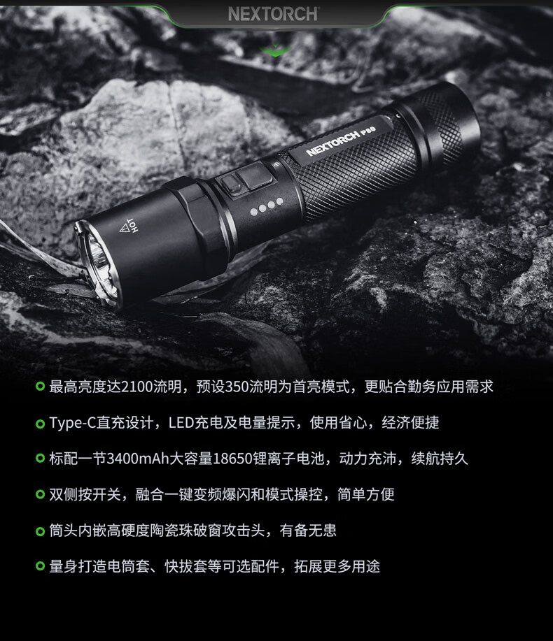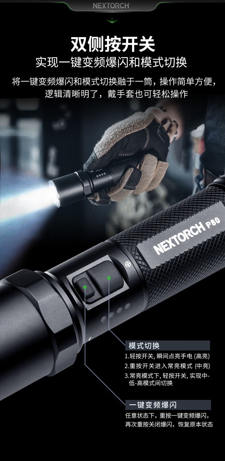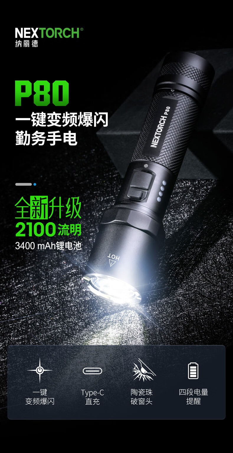 纳丽德纳丽德P80强光手电筒爆闪超亮远射充电防水战术破窗户外防身执勤