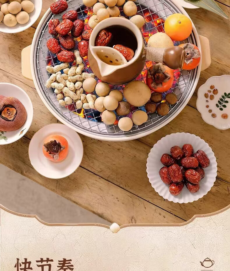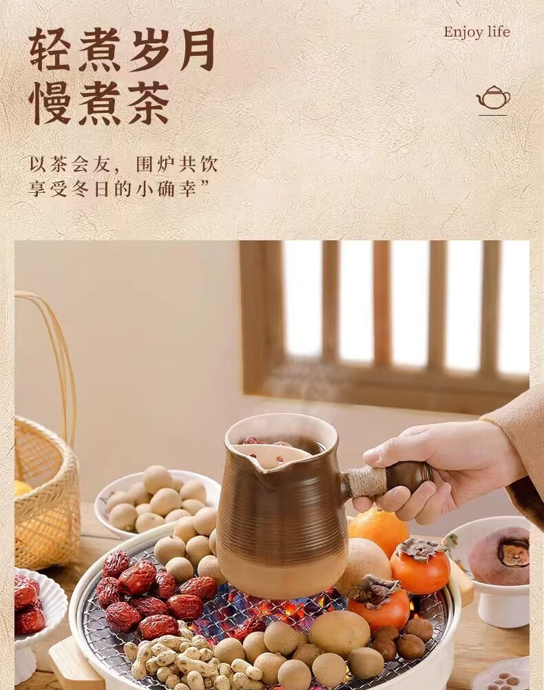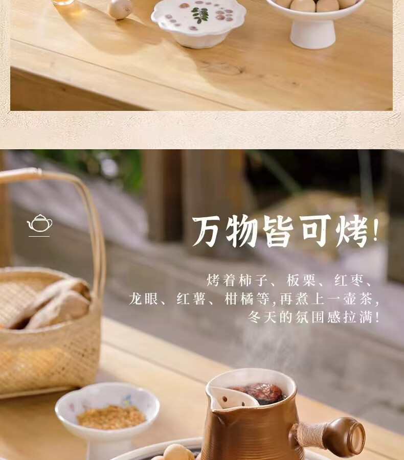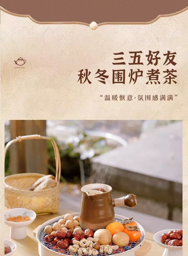 围炉煮茶闻暖,且喜人间好时节。惬意的午后时光,肆意享受冬日的浪漫,万物皆可烤的烟火气,让这个季节格外温暖。冬天的午后,围着炉子烤着火,吃着热乎乎的烤红薯、糖炒栗子、烤柿子,嗑着瓜子剥着花生。再来上一壶浓香四溢的花茶或者奶茶,享受着生活的慢节奏,把一切烦恼抛在脑后,释放压力,幸福感爆棚。围炉煮茶在这基础上又多了一份仪式感、氛围感。
