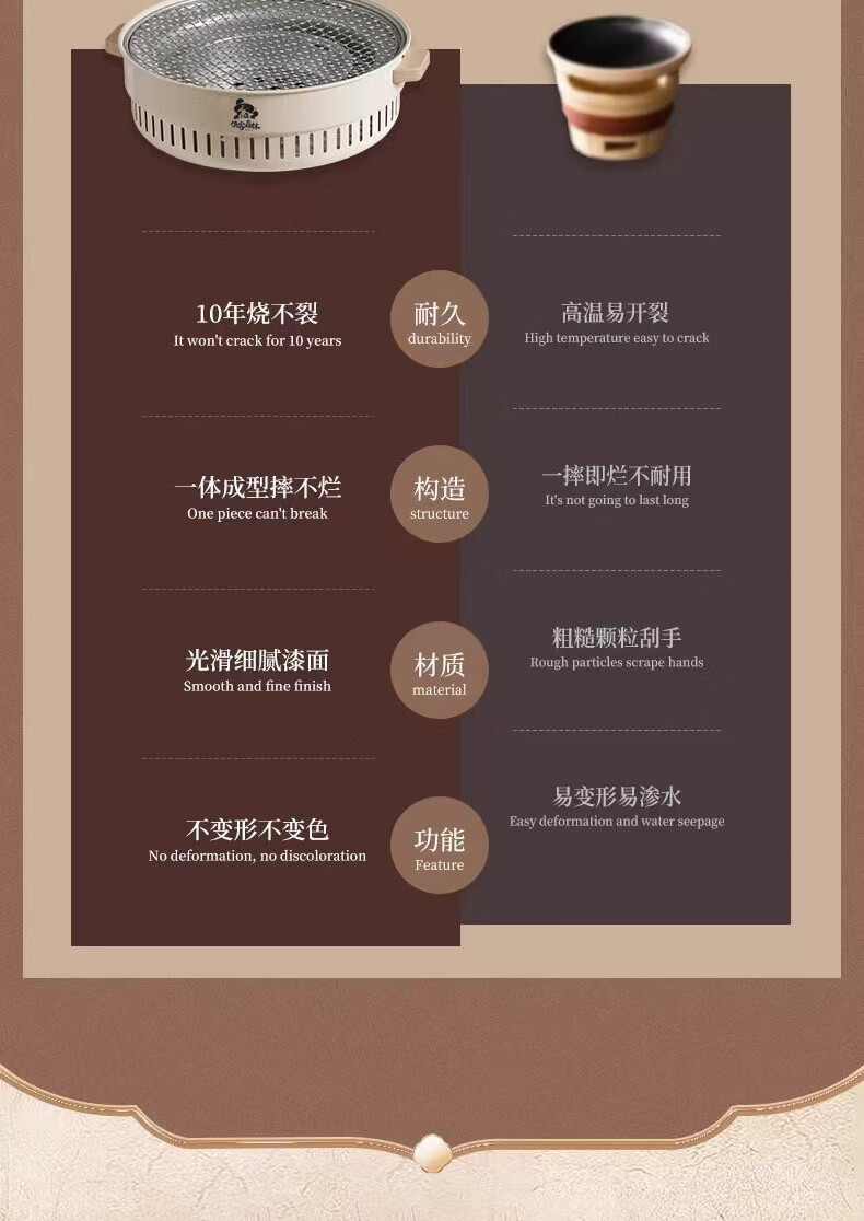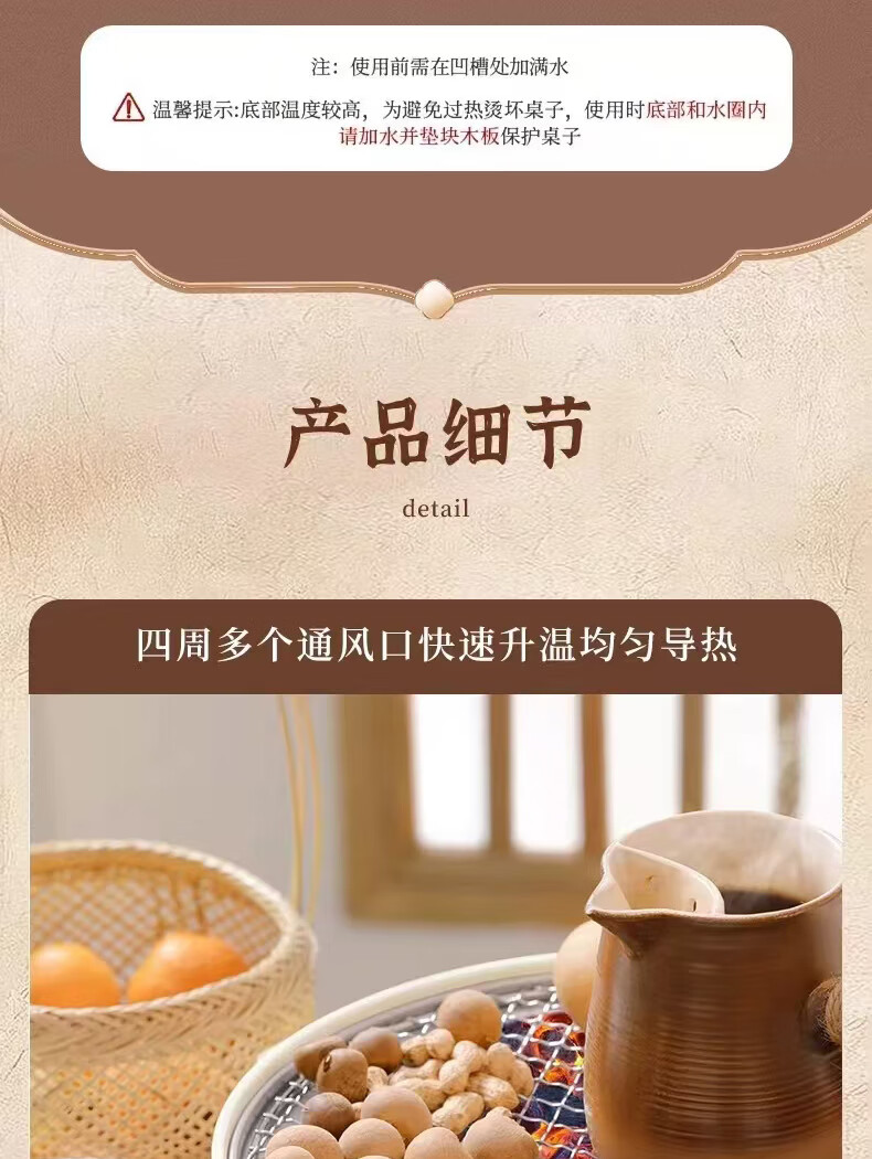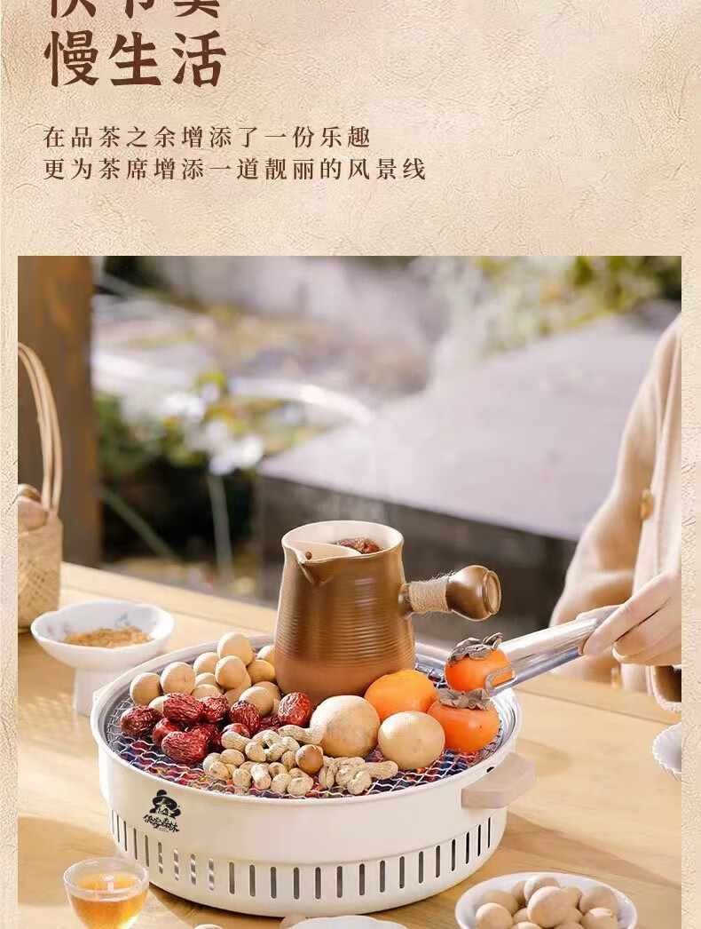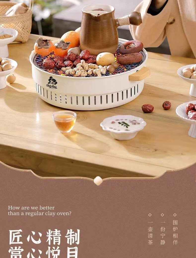 物美价廉,方便携带,盆里加水,炭盆一周加水设计很适当有宝宝的家庭,隔热效果很好。煮个茶,烤个烟薯,玉米都可以做到。不比一千多的体验感差,该有的效果都能达到,真的不错!