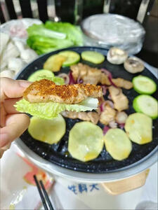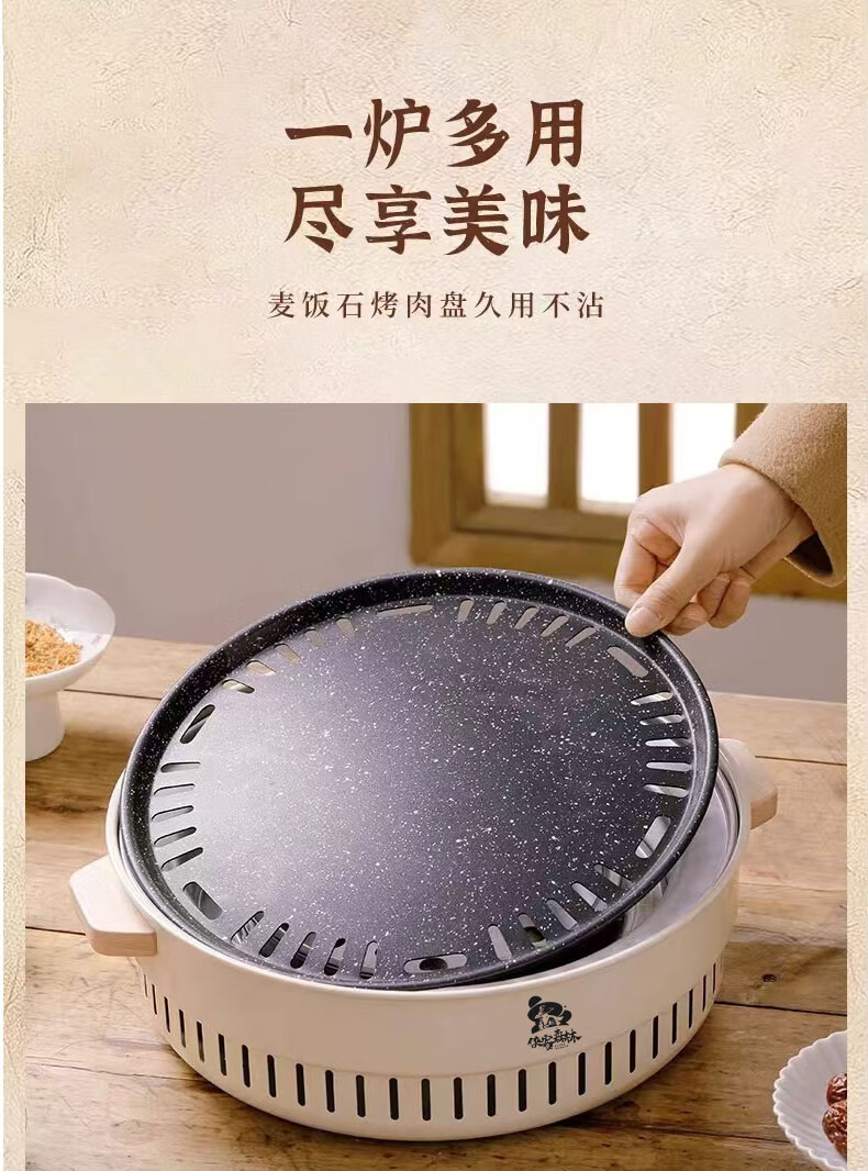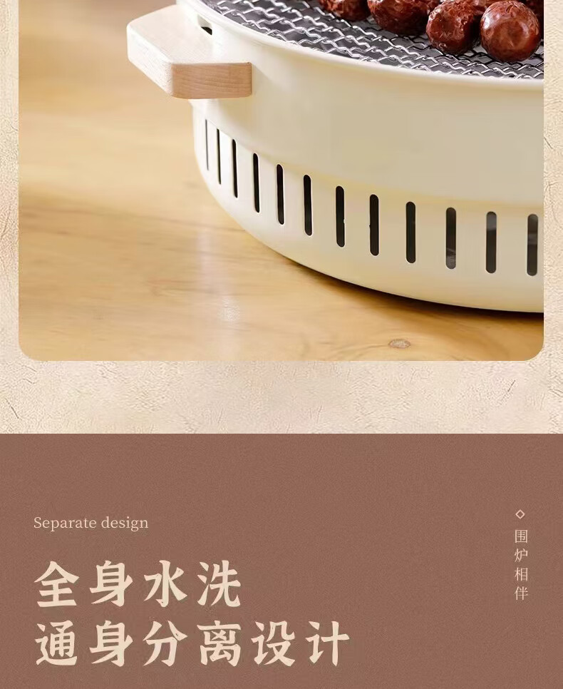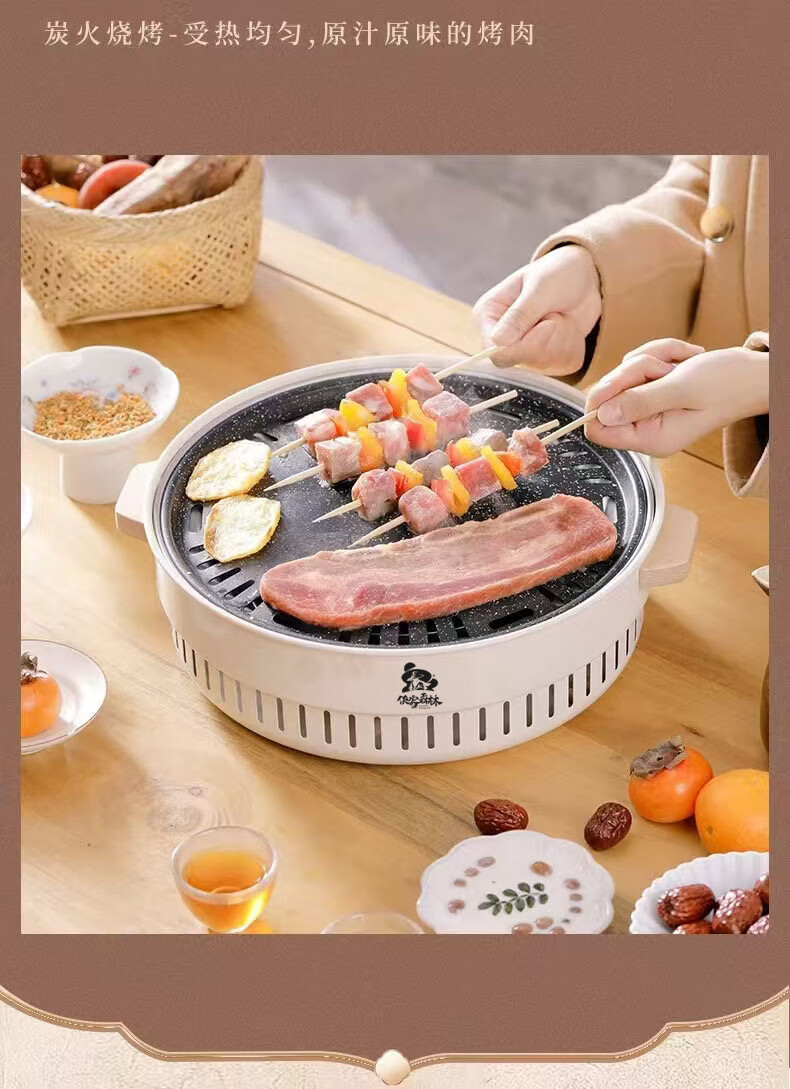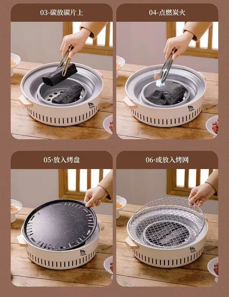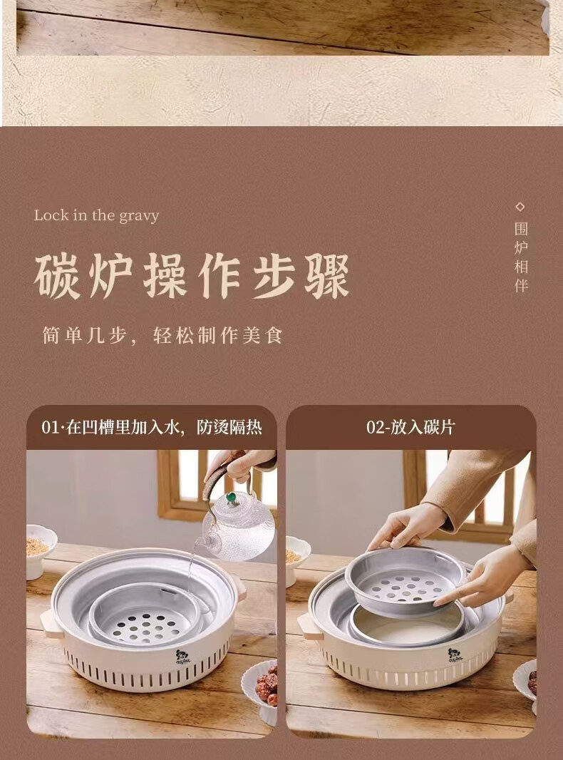 底盘可以加些水,防止烫桌 炉子很好用,一家三口可以在家过把瘾 燃气炉快速点燃炭块,烟机一开,食材一放 在家该干嘛就干嘛,很满意。