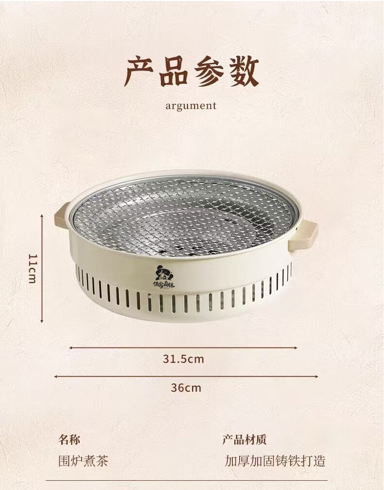 拿到手还挺沉的,质量挺不错的。根据商家说的用法去使用起来确实没问题,炉壁摸起来也不烫。整个围炉都是可拆卸的,清理也方便,这个价格真心划算!带小朋友一起围炉煮茶挺不错的,用烤盘烤肉也没有油烟。小朋友喜欢吃烤肉,我们喝喝茶解解腻