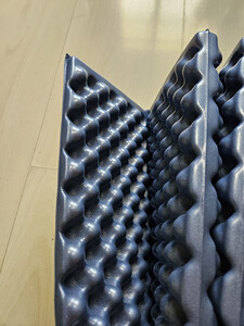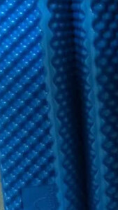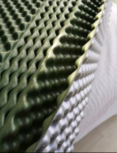 蛋槽防潮垫重量轻,尺寸够大,折叠收纳方便,不像普通平面款那样自动卷起,宽65厘米足够大,底面铝膜防潮,新品异味不大,不足就是没普通平面款睡着舒服,感觉有点铬特别侧睡时,虽然材质比较软。一百块还可以,一百二有点贵