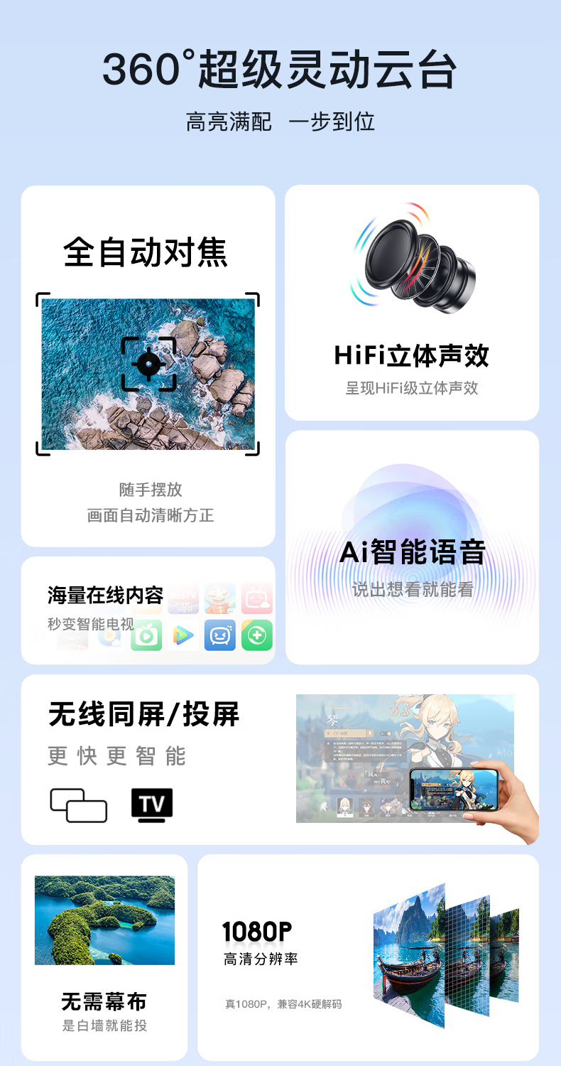 虾皮2025新款云台投影仪家用1080P超高清高亮度投墙客厅卧室家庭影院便携手机无线投屏电视平替 智能版