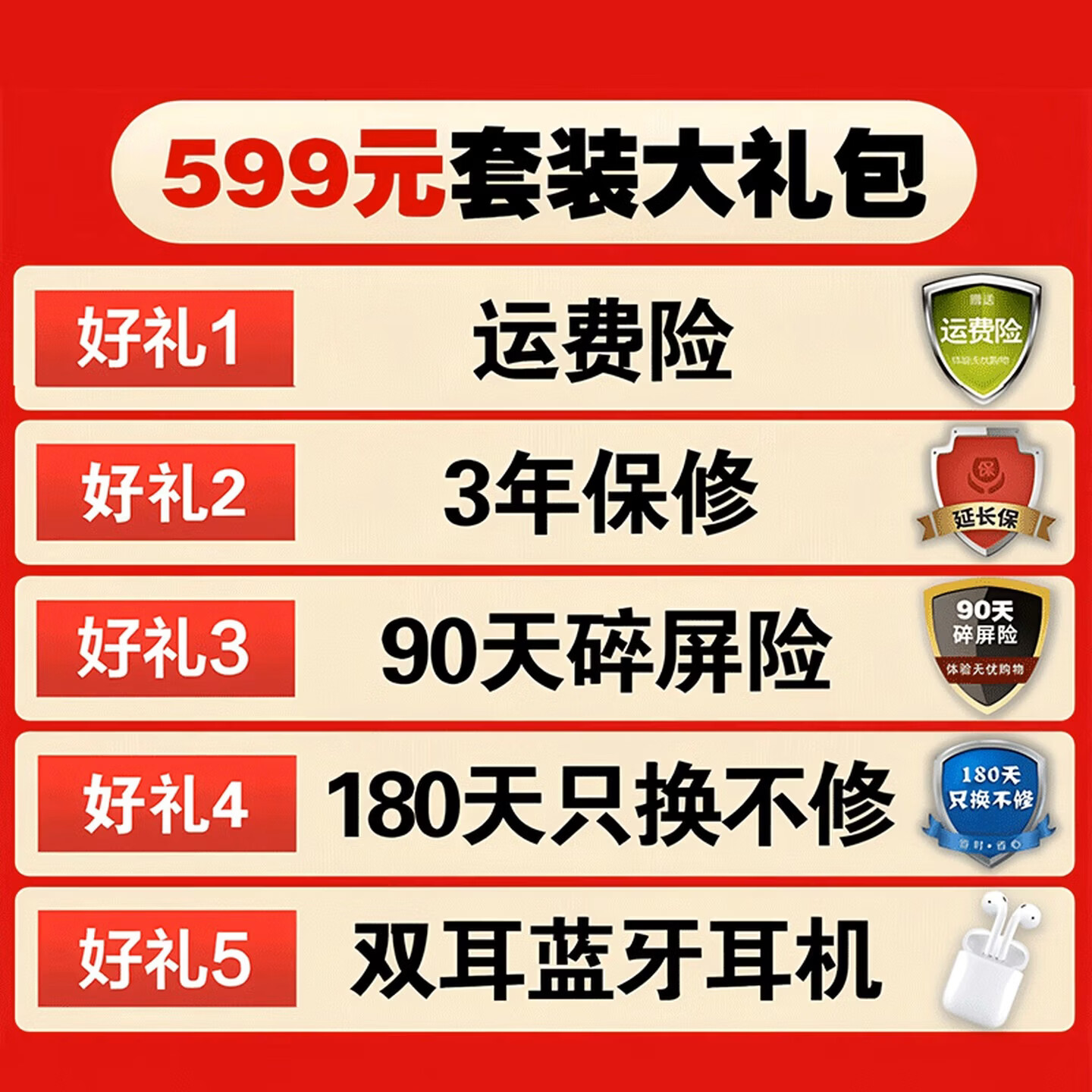 外包装彩盒内标配: 1、手机(内置电池)× 1; 2、充电器 × 1; 3、USB Type-C 数据线 × 1; 4、TPU保护软壳 × 1; 5、取卡针 × 1; 6、TP保护膜(出厂已贴在手机上