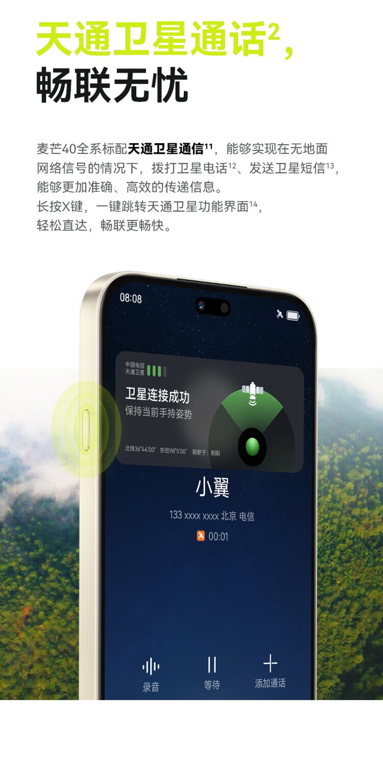 AI大模型,卫星通话,轻薄,高频PWM调光,防水防尘,红外遥控,大底主摄