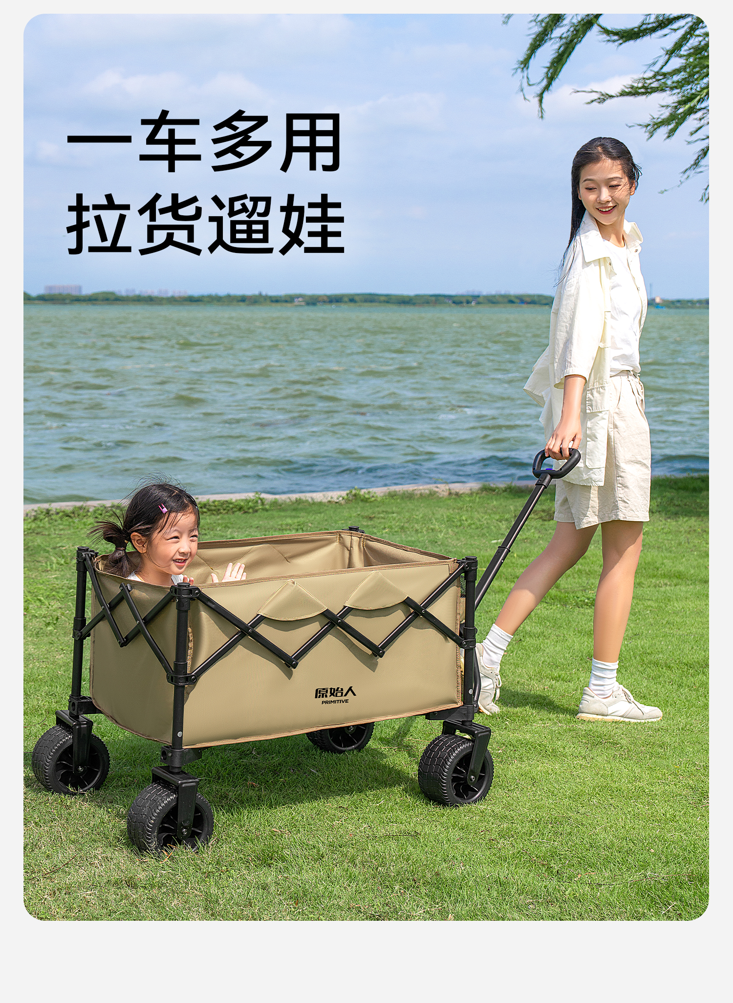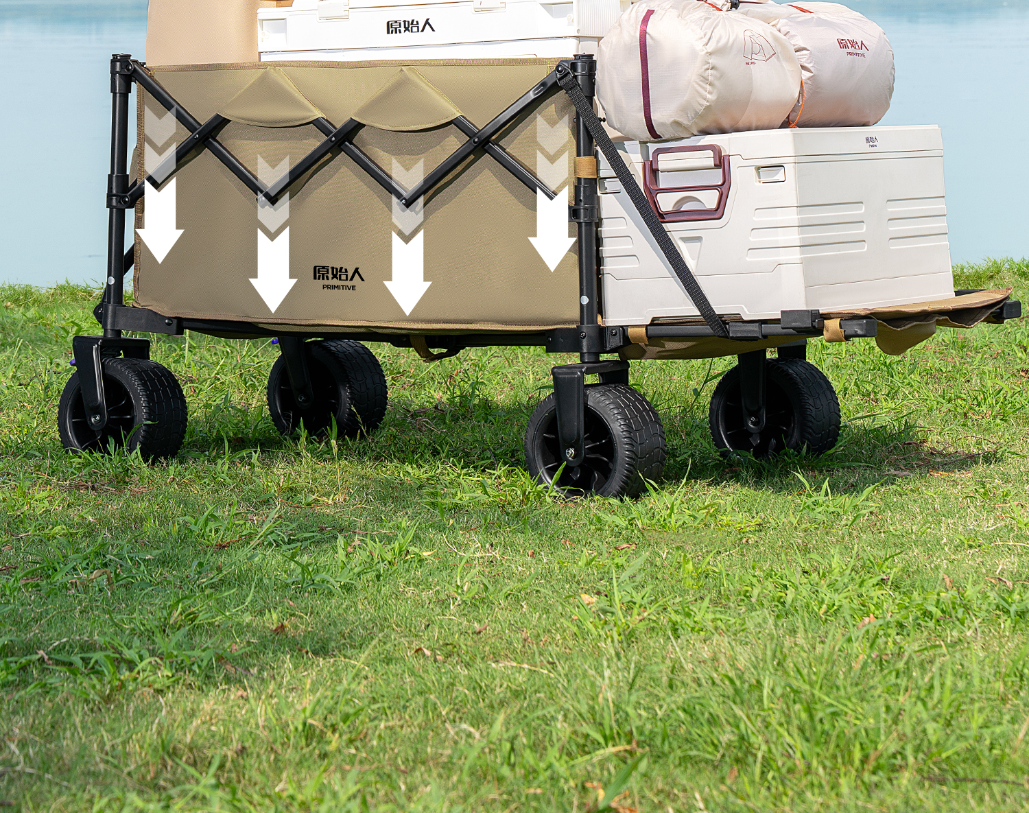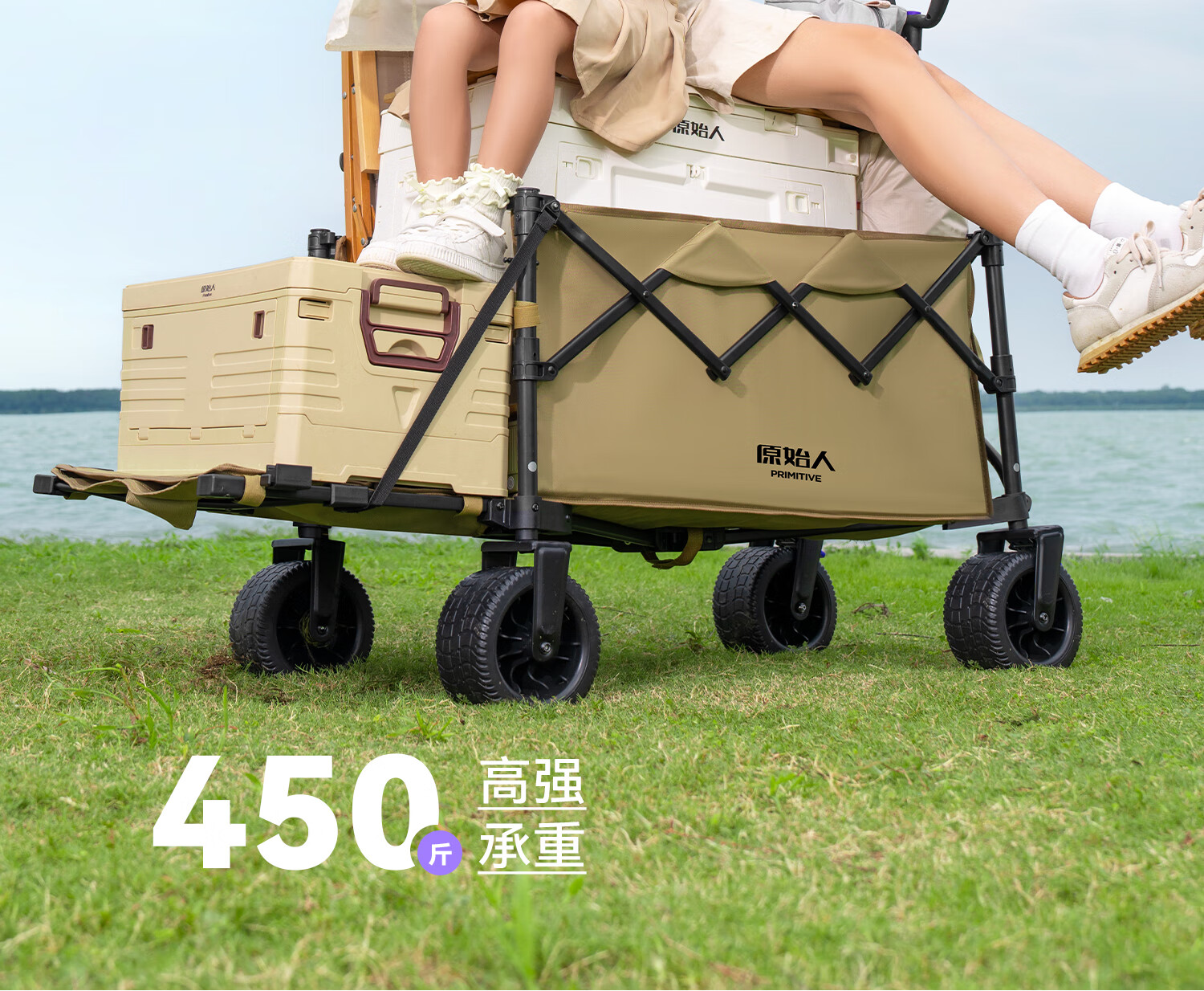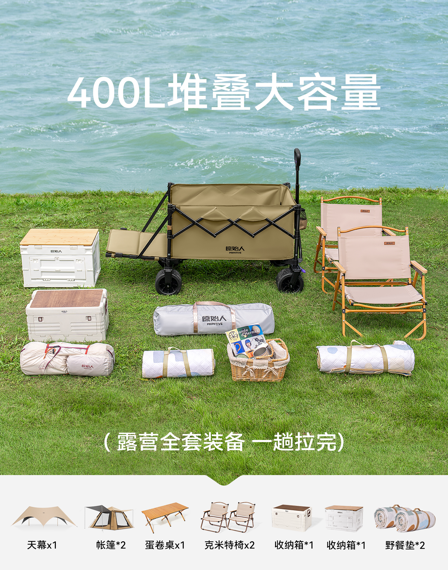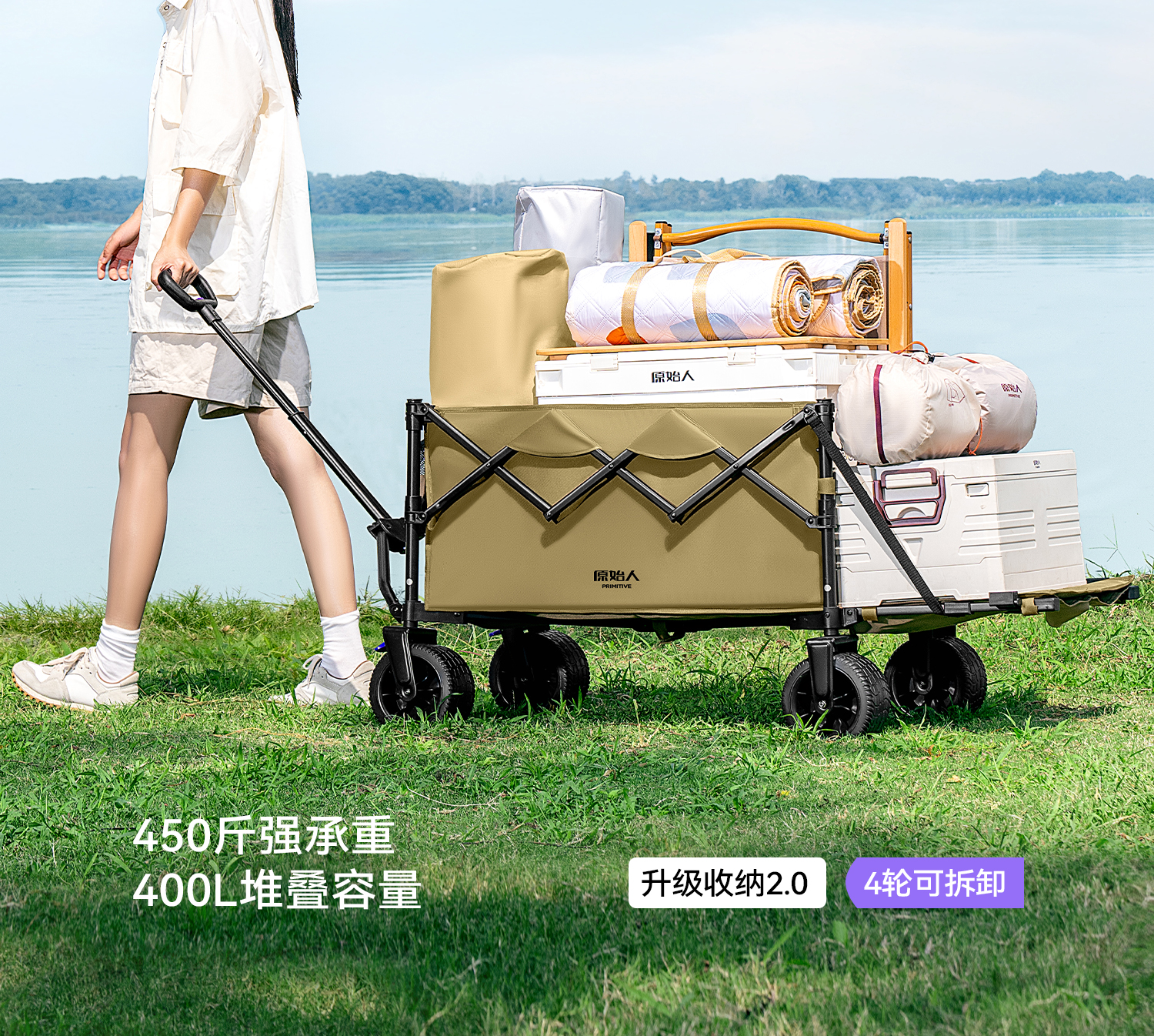 原始人(The Primitive)露营车折叠推车户外野营手推车营地小推车野餐儿童可躺聚拢旅行 400L 加大款沙棕-双快拆+后开模式