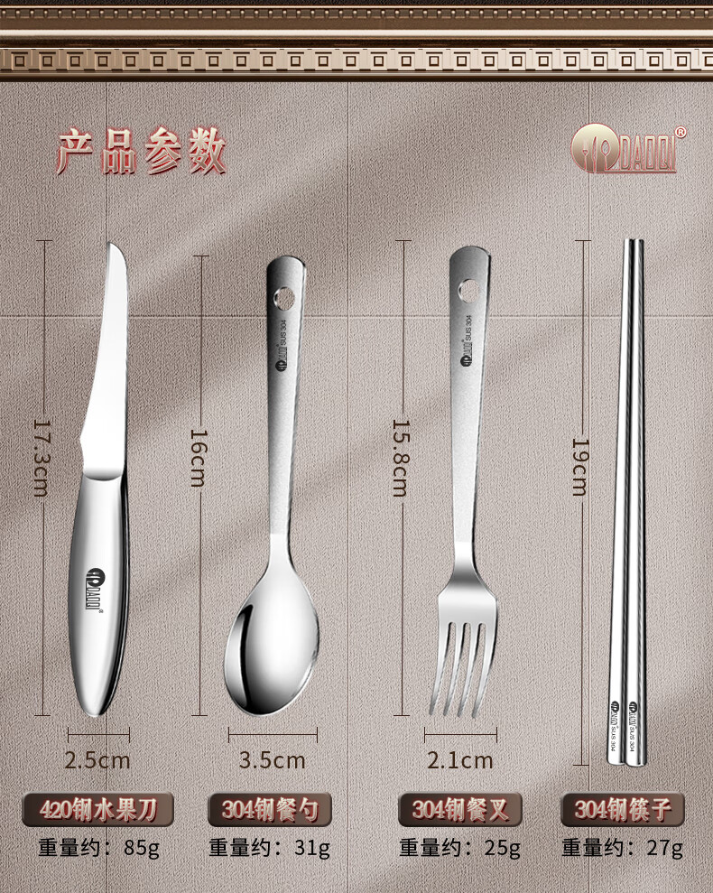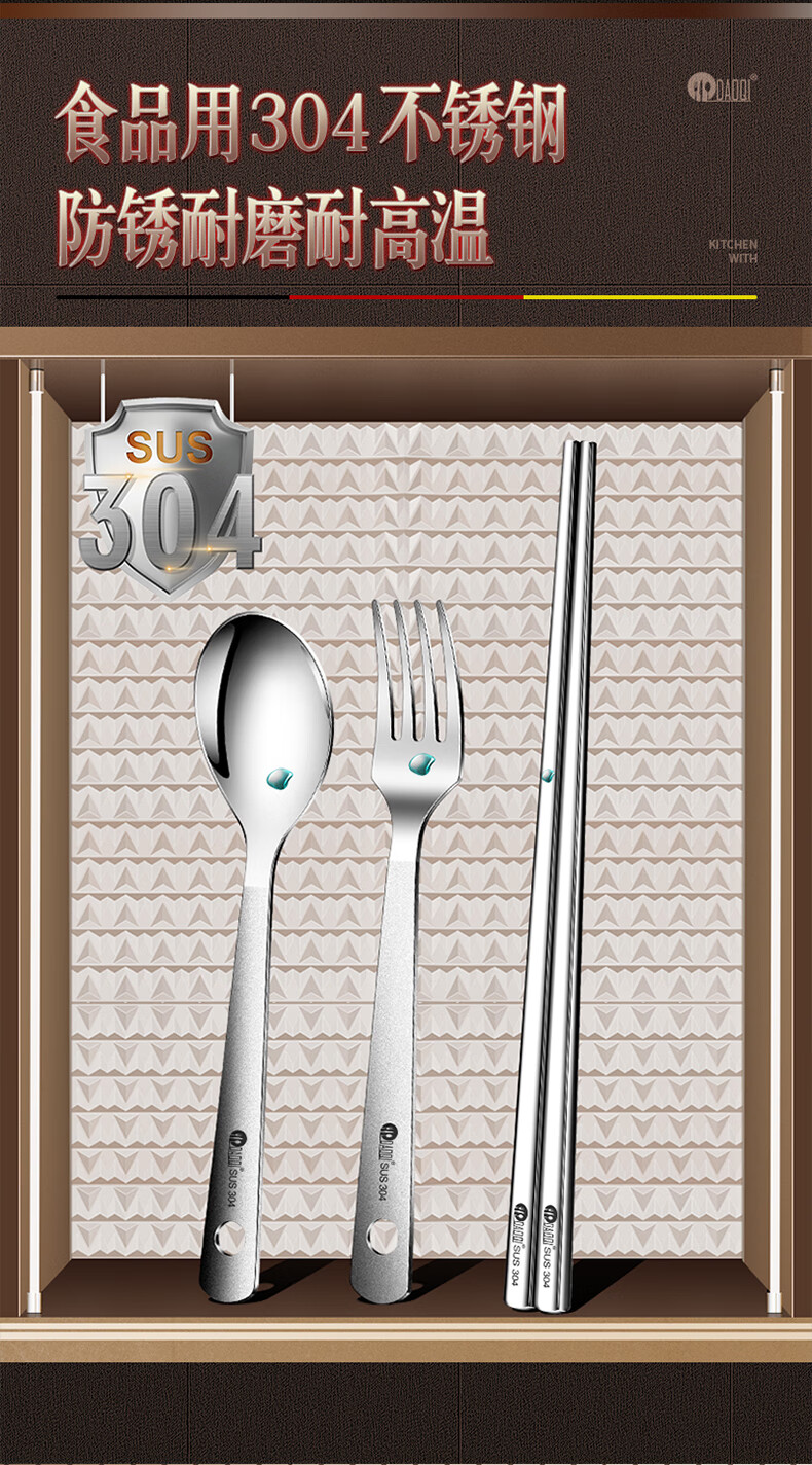 304餐具质量还可以,袋子质量也挺好的。东西感觉还挺好,清洁很容易用餐巾纸就能擦干净,买回来以后用来旅行时吃饭用的,很容易被收纳。