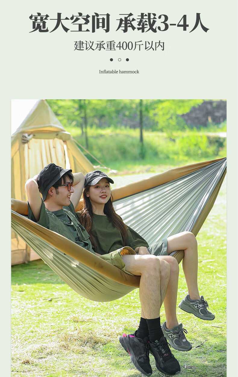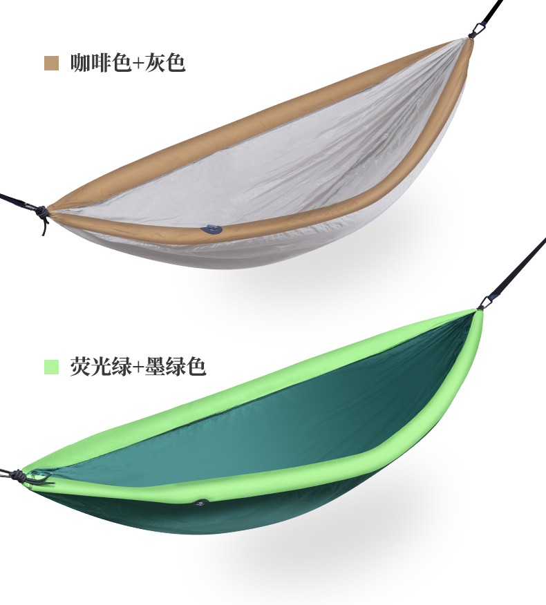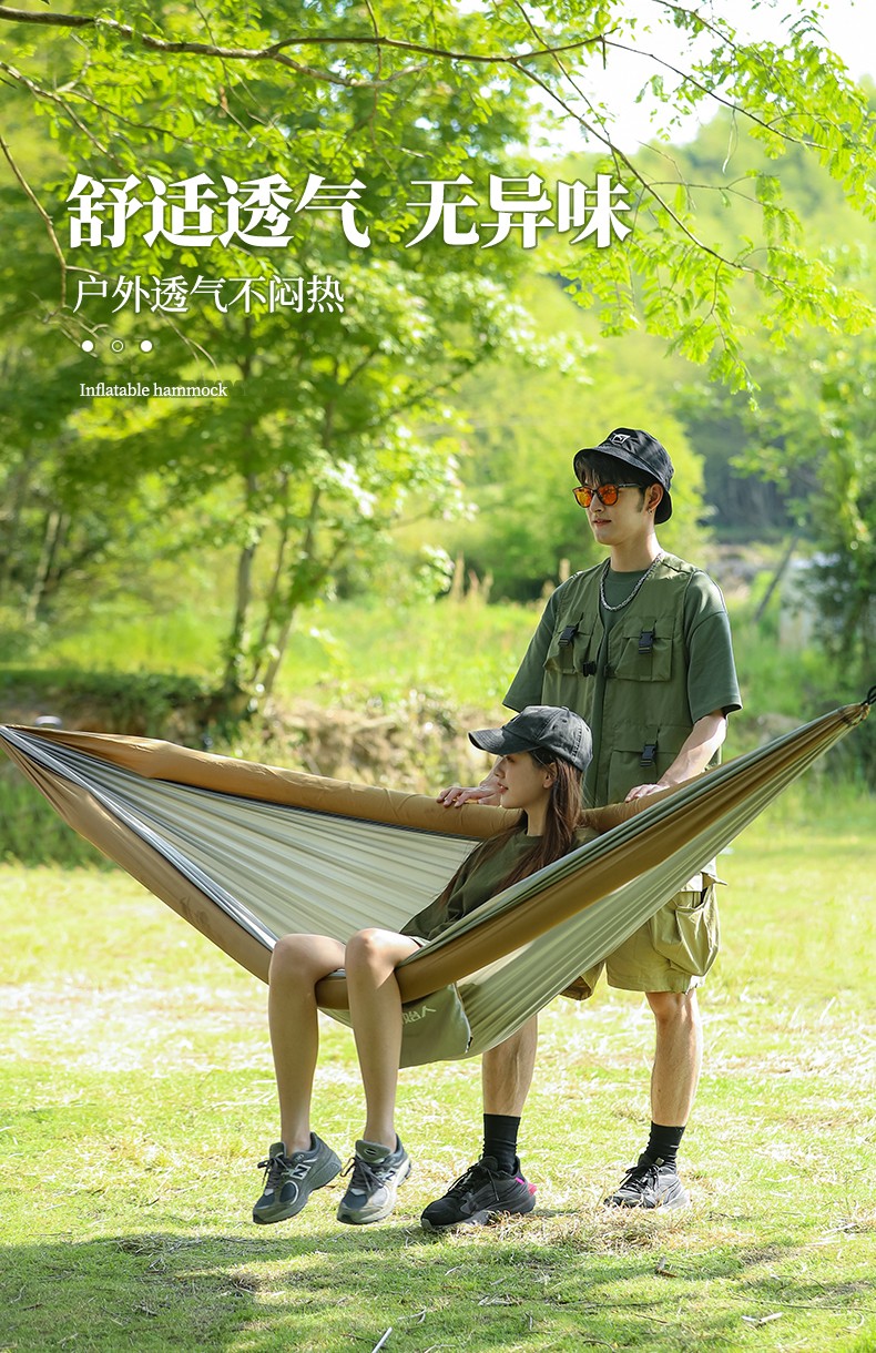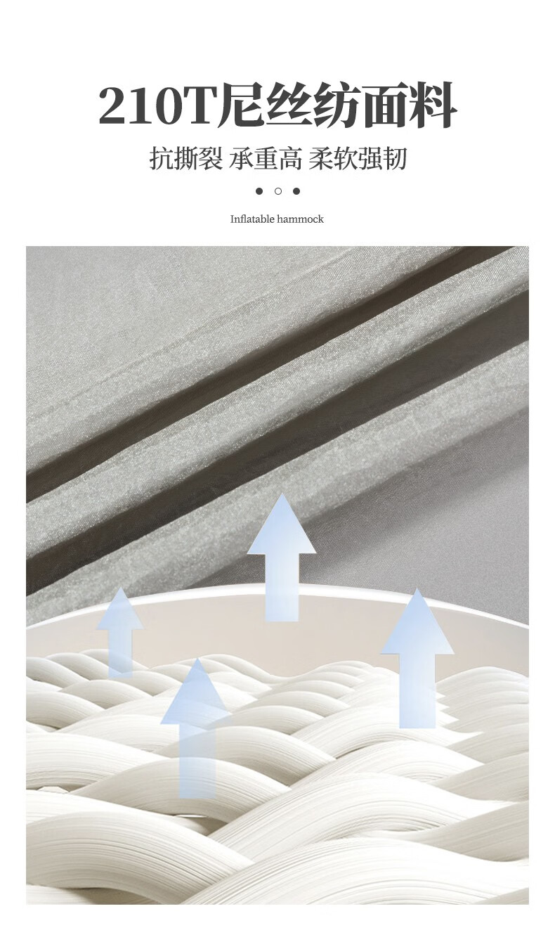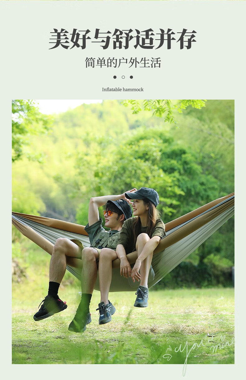 材质好,易收装,在里面不会有那种不透气的感觉,收纳袋里面还有很贴心的教你按装的说明书,吊床两边的气囊3口气就能吹满,很喜欢