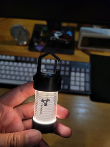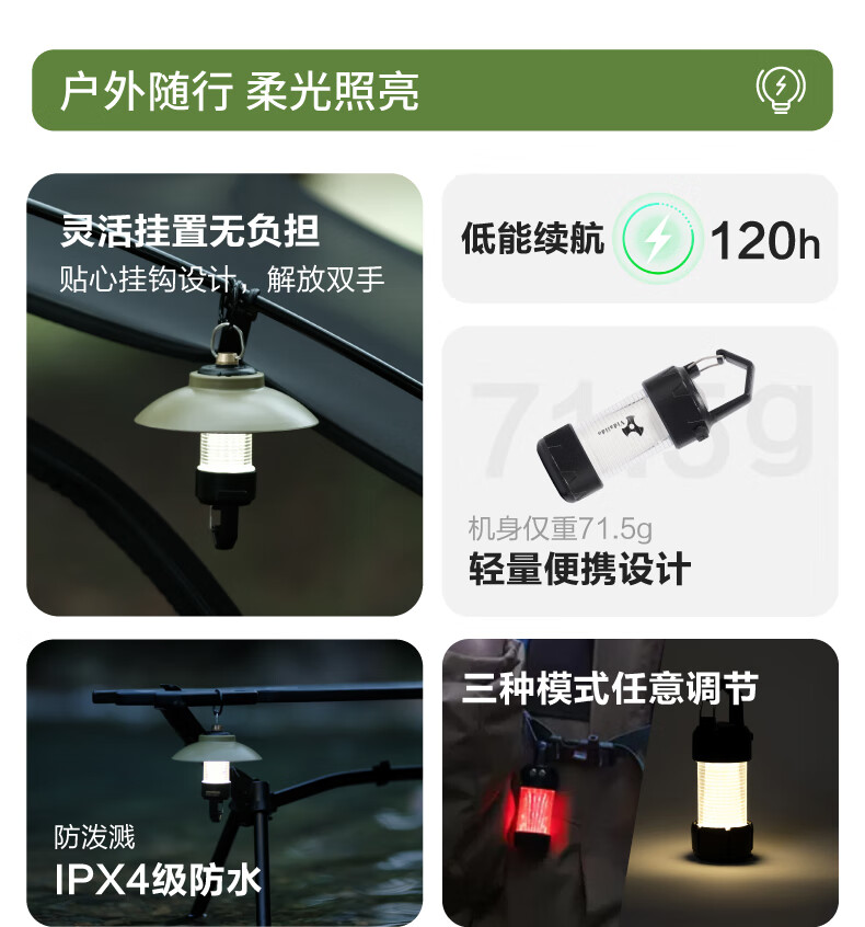 买的比较好的平替,露营时候功能很齐全,可以当手动也可以用磁力吸在车顶或者其他的地方。安装上,灯罩以后,又可以放在桌面上使用用处很多,我主要放在帐篷里面作为也能使用关灯,以后会出现绿色的荧光光环很漂亮。