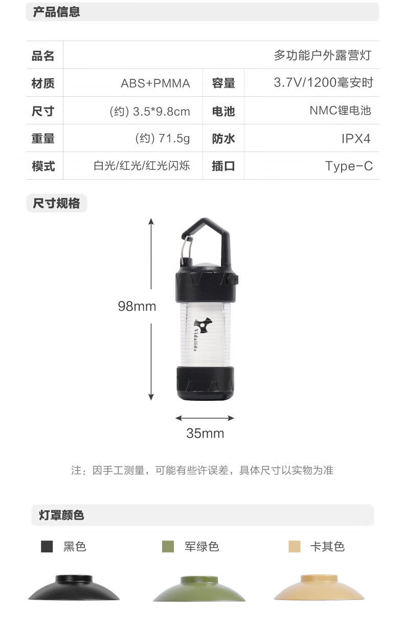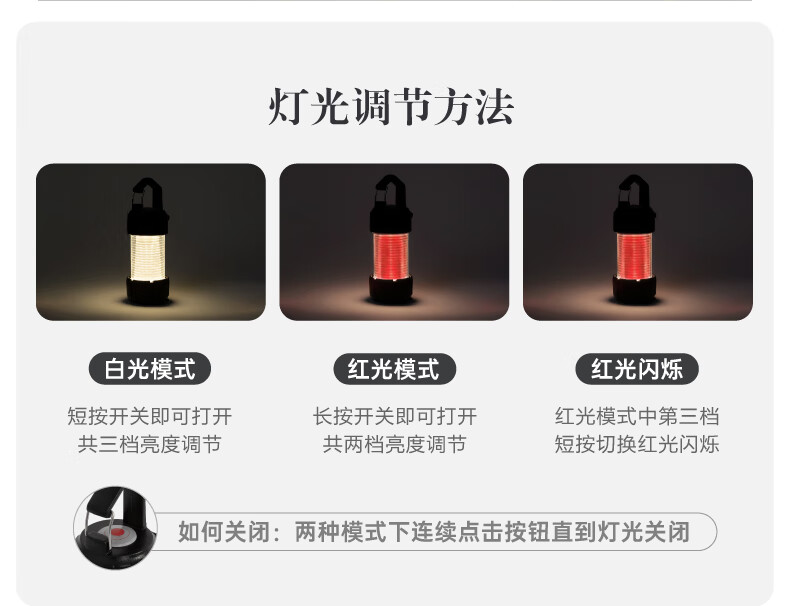 小巧轻便。 亮度高,使用时间长。 徒步露营负担小。 光照强度:三个档,白光和红光,红光还可闪烁 续航时间:长