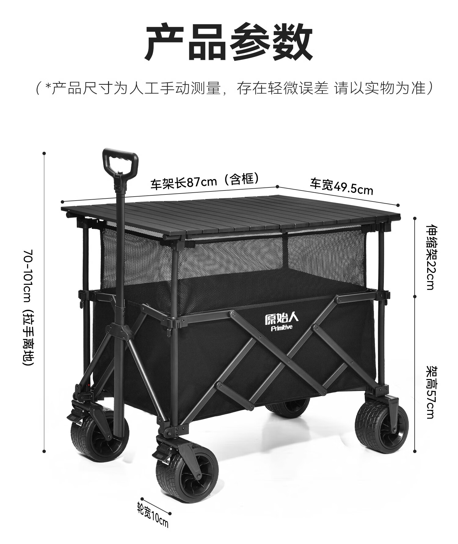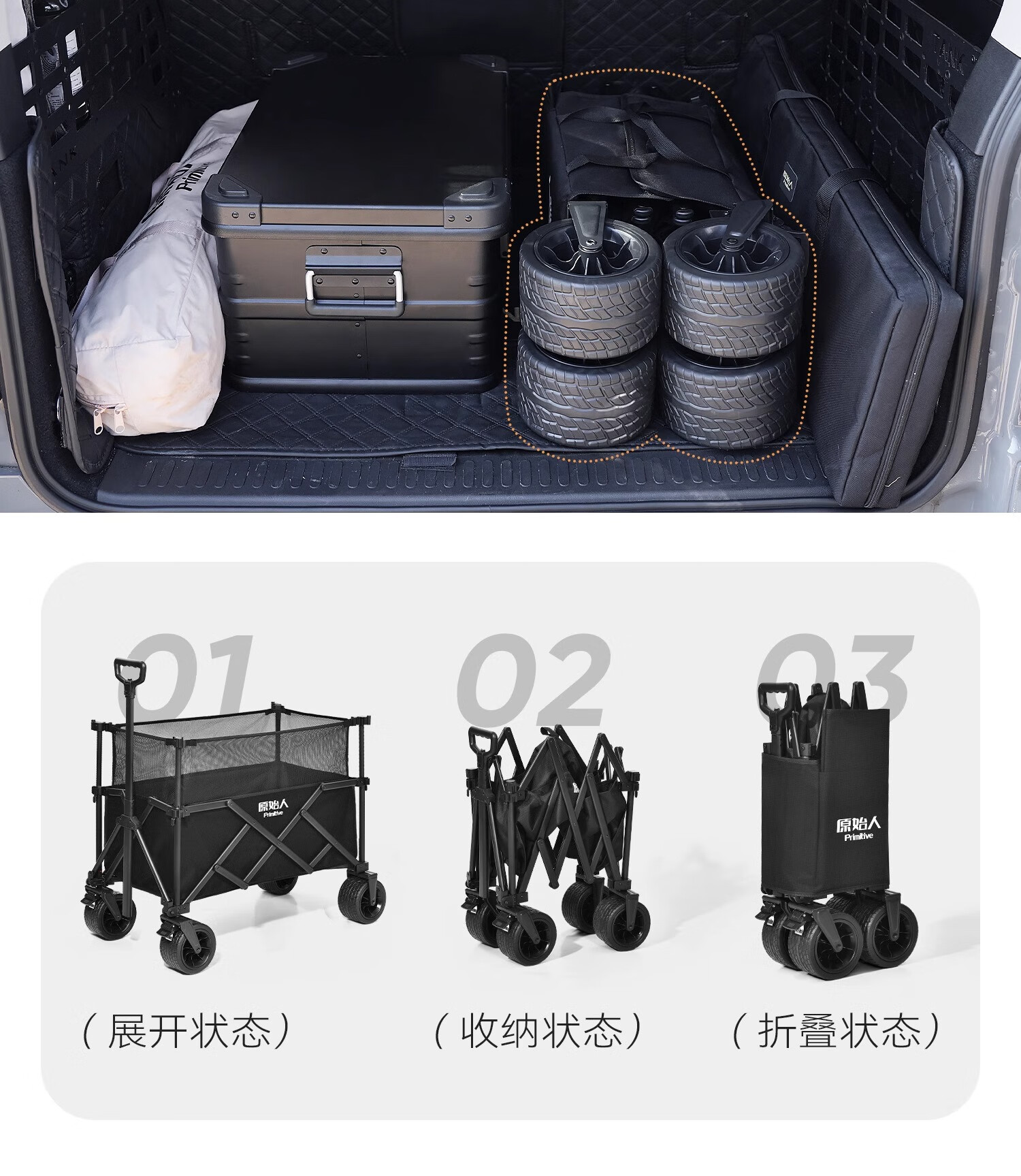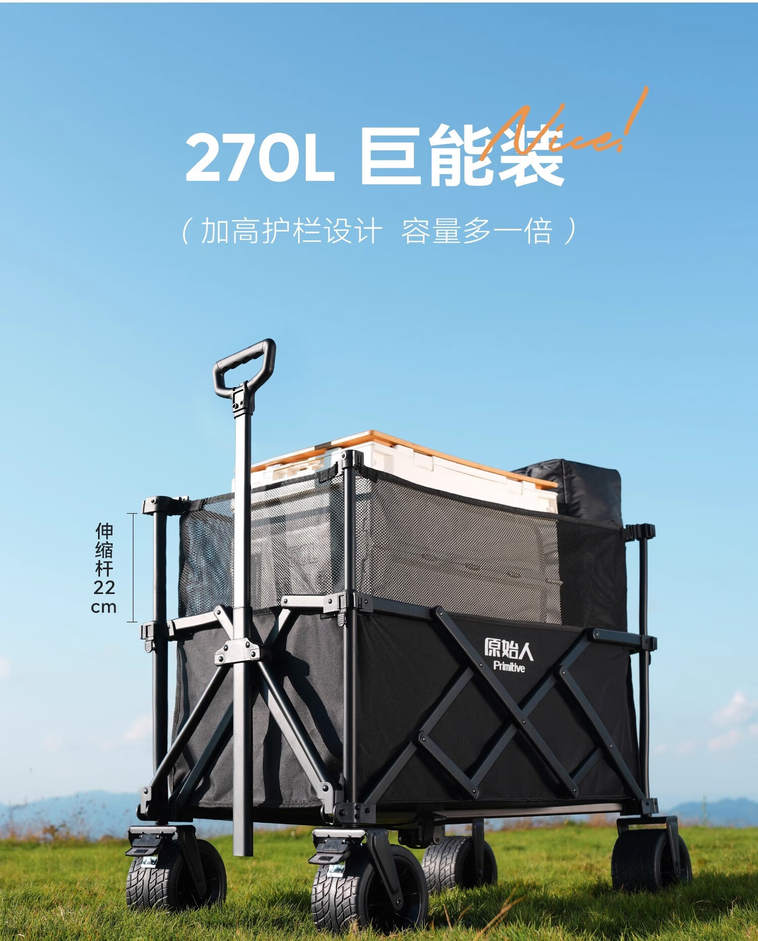 原始人户外露营推车可折叠野餐营地旅行小拖车拉车野营大号遛娃手推车 270L 曜黑【加高越野款】+万向轮