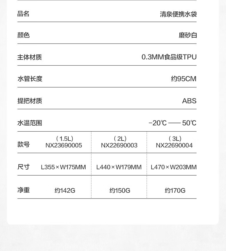 这个水袋真的挺不错的!它的容量很大,可以装足够我一天喝的水,不用频繁地去加水。材质也非常好,摸起来很厚实,感觉特别耐用,而且没有异味,让人用着很放心。水袋的设计很合理,有个提手,携带起来很方便,不管是放在包里还是直接提在手上都没问题。出水口的设计也很棒,水流大小可以轻松控制,喝水的时候很顺畅,不会洒出来。还有它的密封性能特别好,完全不用担心会漏水。另外,它的外观简约大方,颜色也很正,看着就很喜欢。清洗的时候也很容易,不会有死角残留污渍。总之,这个水袋在各个方面都表现出色,是我用过的最好的水袋之一,强烈推荐给大家!