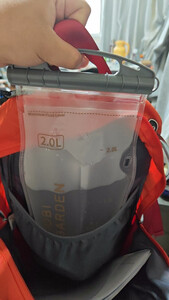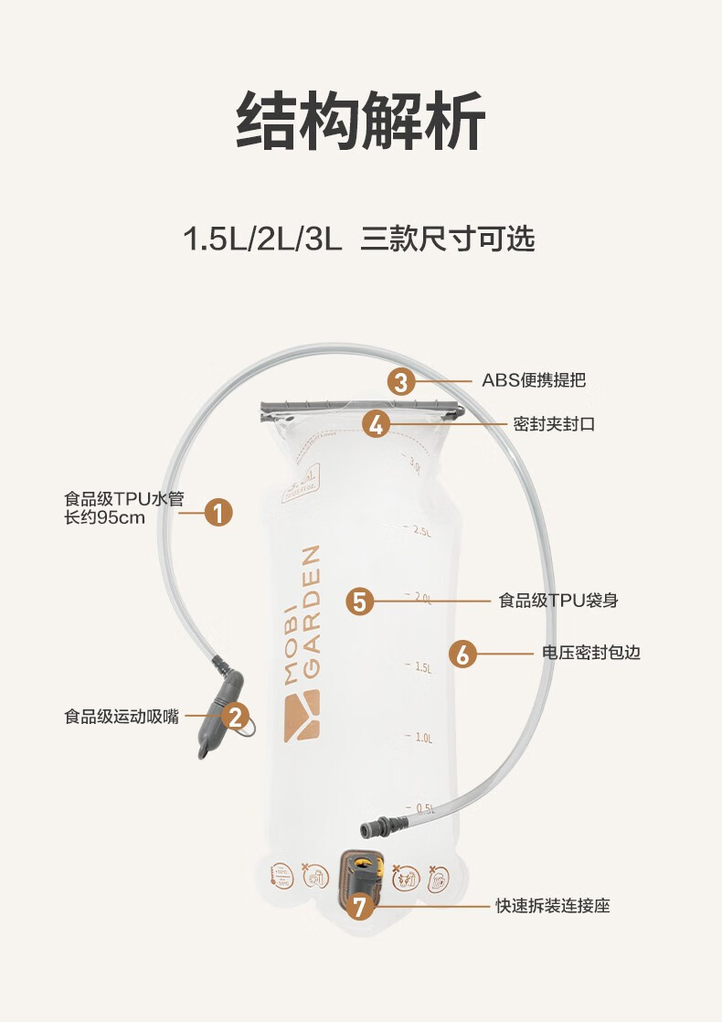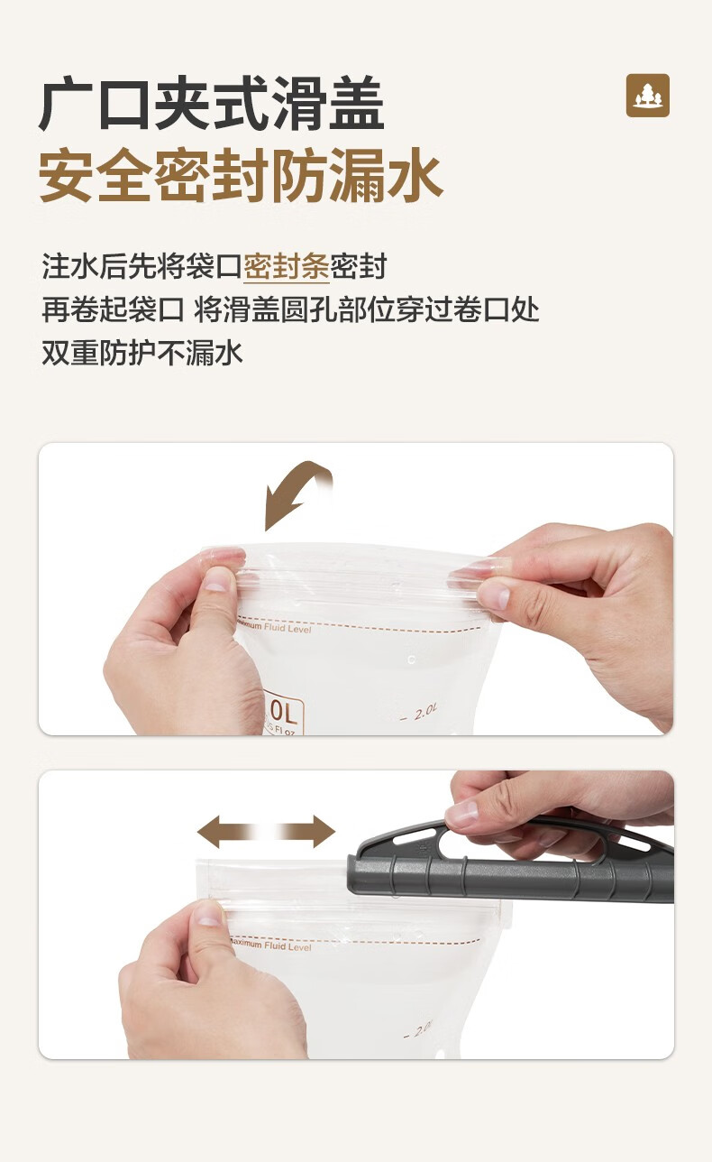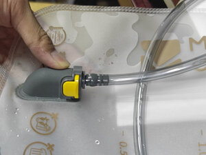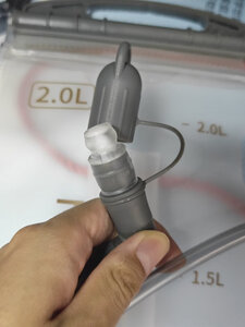 水袋用起来,我是没感觉到有什么味道,只是简单冲了一遍而已。喝水没问题,想喝水的话需要用嘴咬住水管另一头的白色区域,这个地方配备了防尘盖,日常使用也不用担心进灰。 水袋口有双重密封设计,这方面看图比较直观一些。 水袋内侧相当于是两仓位,中间有隔断,可以防止水在内部荡悠。 水袋插口是紧贴水袋的,装在包里也不怕被挤。