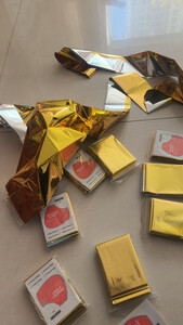 一包十个,很轻便,虽然到现在为止还没有使用过,但作为应急物资先准备上还是好的。材质本身是保温不透风的,很有科学依据,买了金黄色的这款。