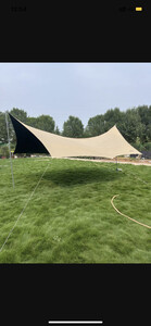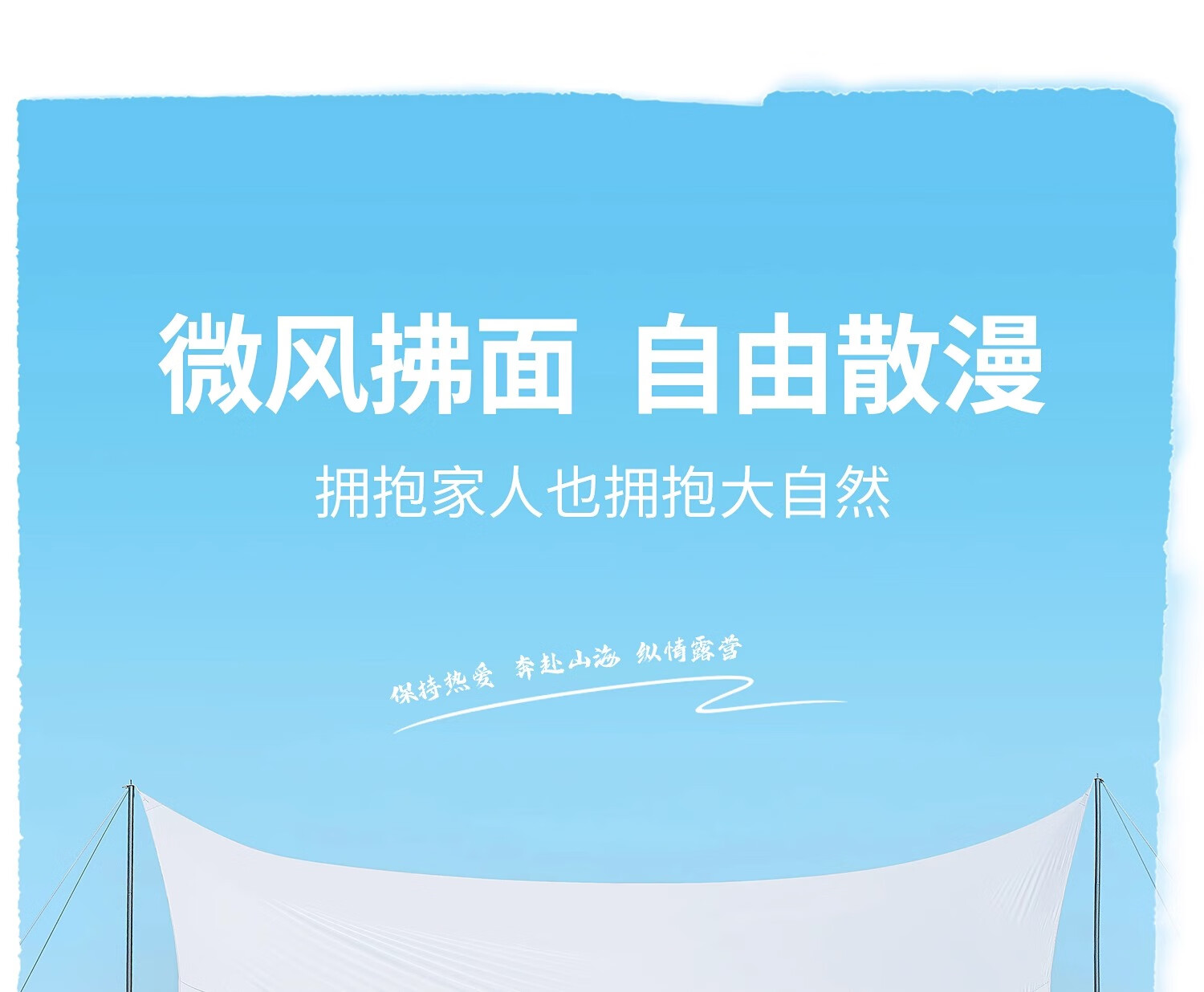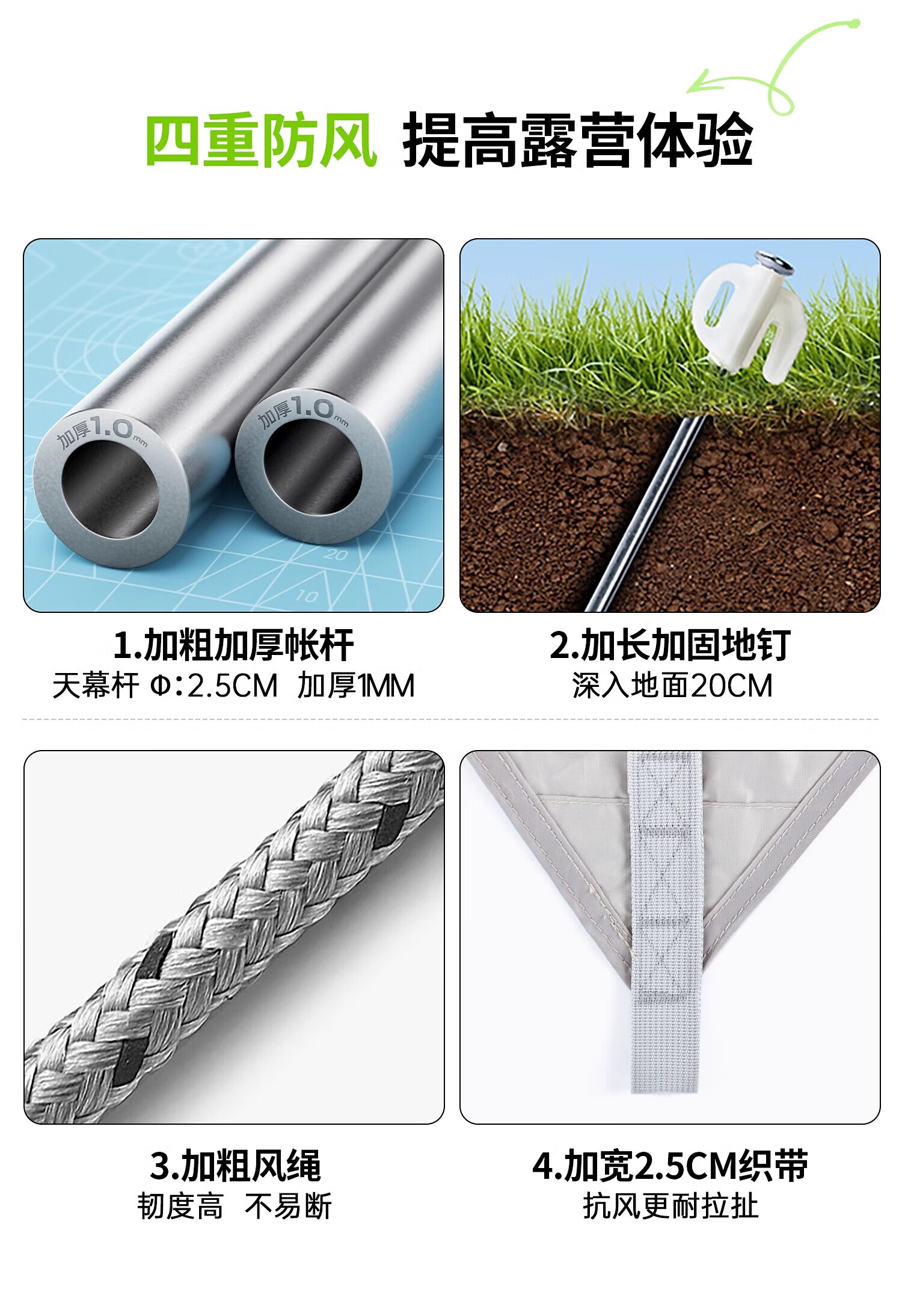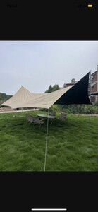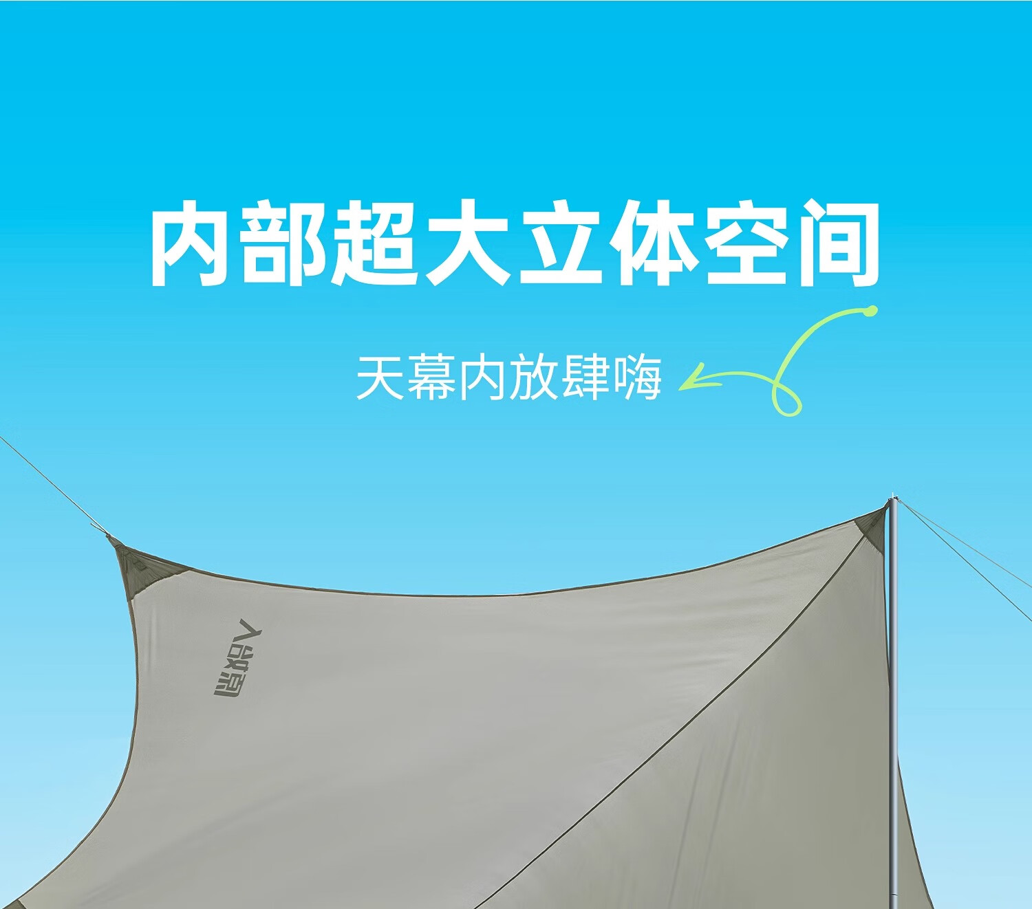 防水效果:还没验证,没下雨 适用场景:户外露营⛺️ 容纳人数:3-6人没有问题 透气效果:四面通透,没问题 展开类型:飞机翼的效果 便携性能:方便携带,就是杆子有点重 价格便宜,做工OK,除开杆子的重量没啥缺点。公园露营⛺️,烧烤🍗都很棒棒。地钉安装方便,易取和固定,6跟绳做工ok,颜色明显,便于识别不会误触。